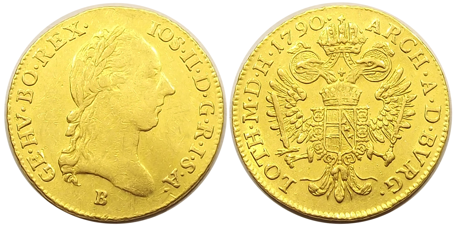 1 dukát 1790 B II. József (Körmöcbánya), nagyon szép állapotban. Ritkábban előforduló, utolsó évjárat. (s-gy
