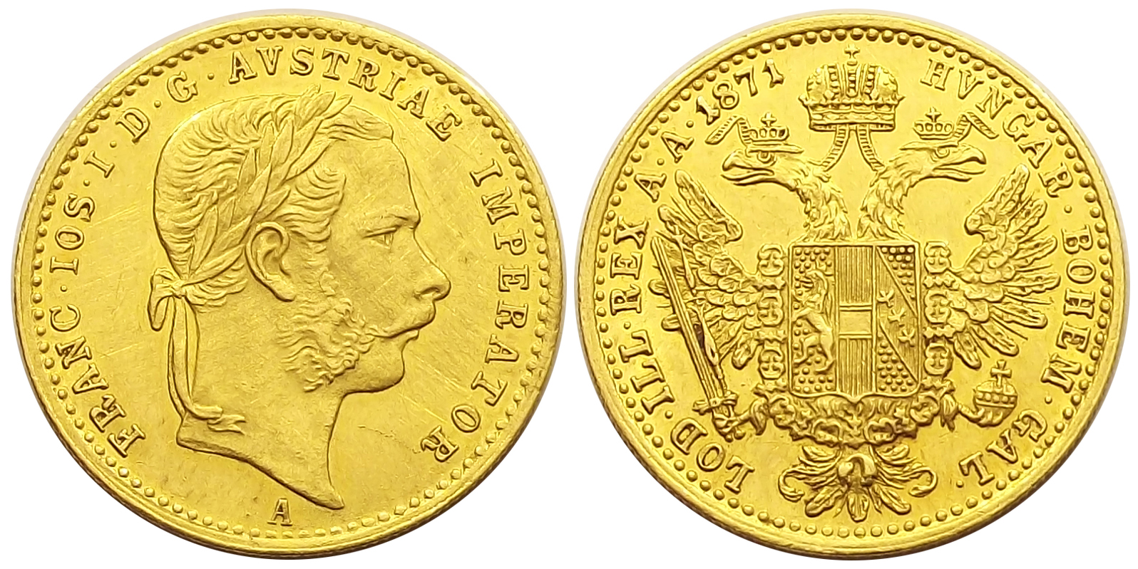 1 dukát 1871 A Ferenc József nagyon szép állapotban, enyhe mikrokarcok az alapsíkon.