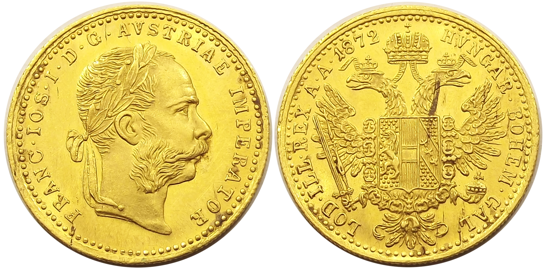 1 dukát 1872 Ferenc József, kiváló állapotban, kivehető verdefénnyel, enyhe koszfoltok. (gt