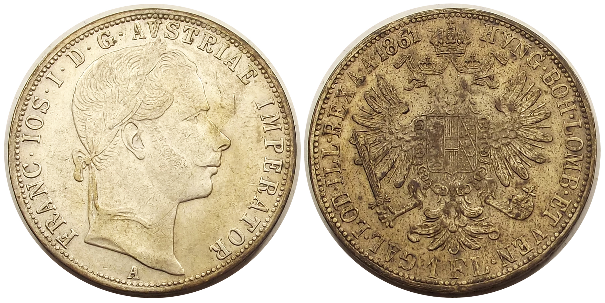 1 florin 1861 A Ferenc József nagyon szép állapotban, enyhe patina ill. kosz az érmén. (lsz