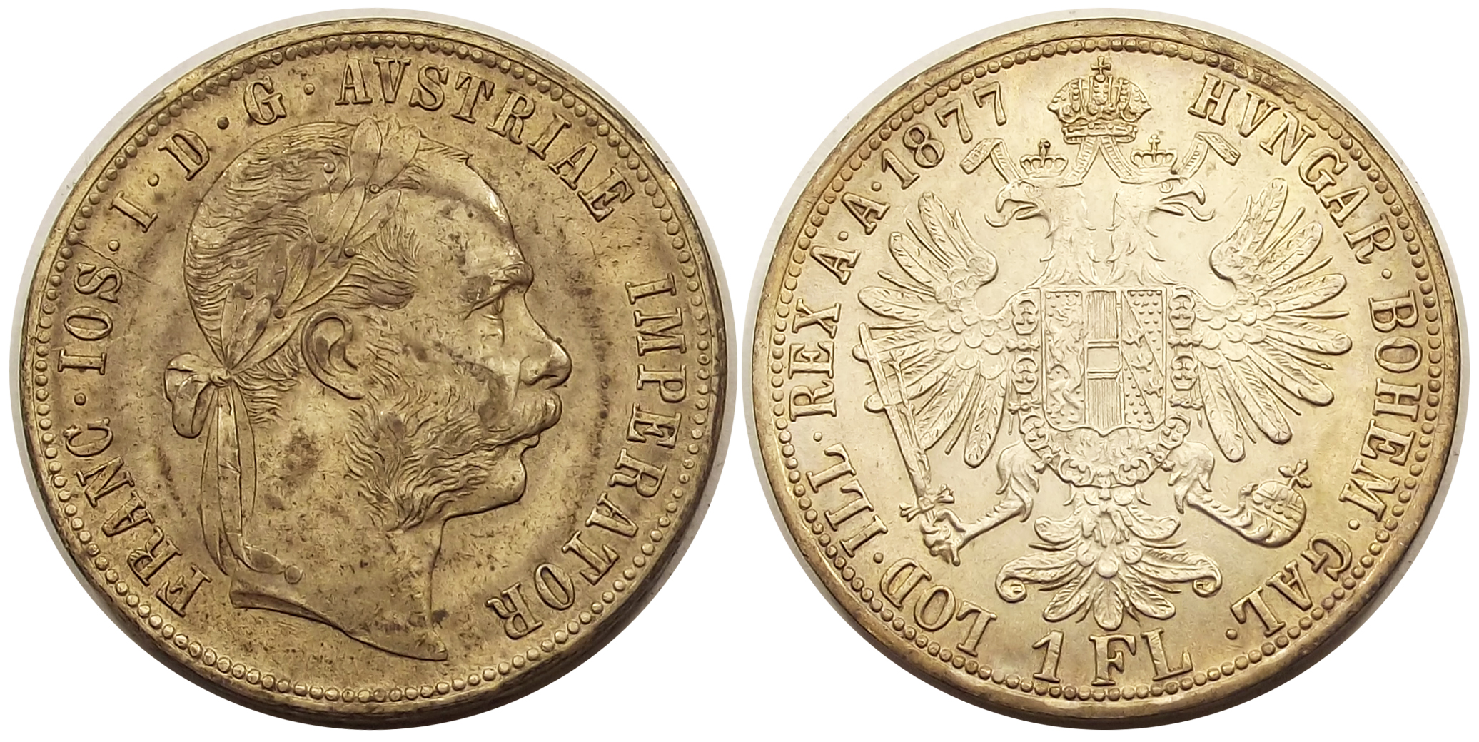 1 florin 1877 Ferenc József nagyon szép állapotban, enyhe patina ill. kosz az érmén. (lsz