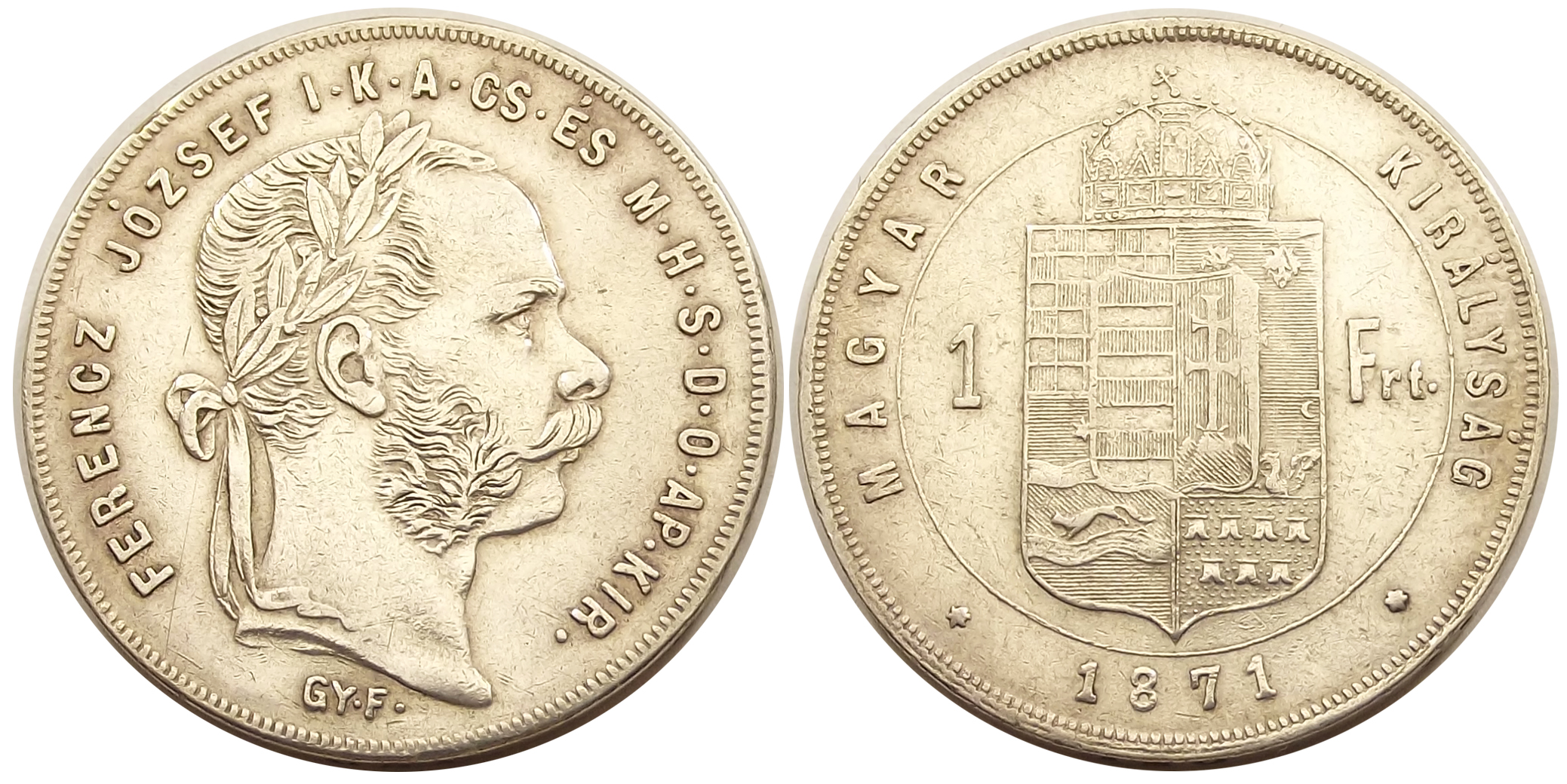 1 forint 1871 GYF Ferenc József nagyon szép állapotban, enyhe tisztítás. A legritkább ezüst 1 forintos. (ec