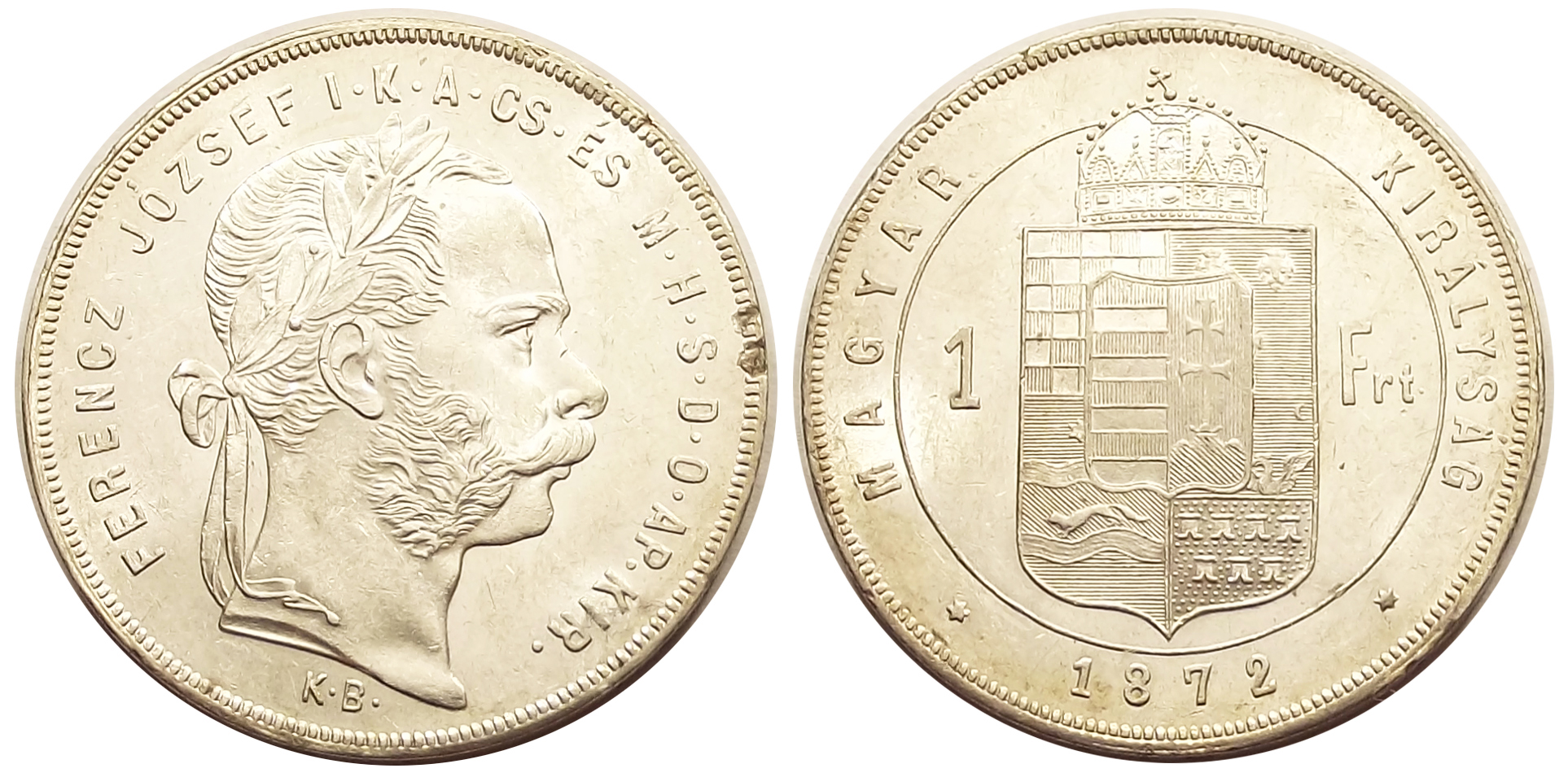 1 forint 1872 Ferenc József, kiváló állapotban, éles portréval és címerrel, verdefénnyel. Veréshiba 3 óránál (h cs
