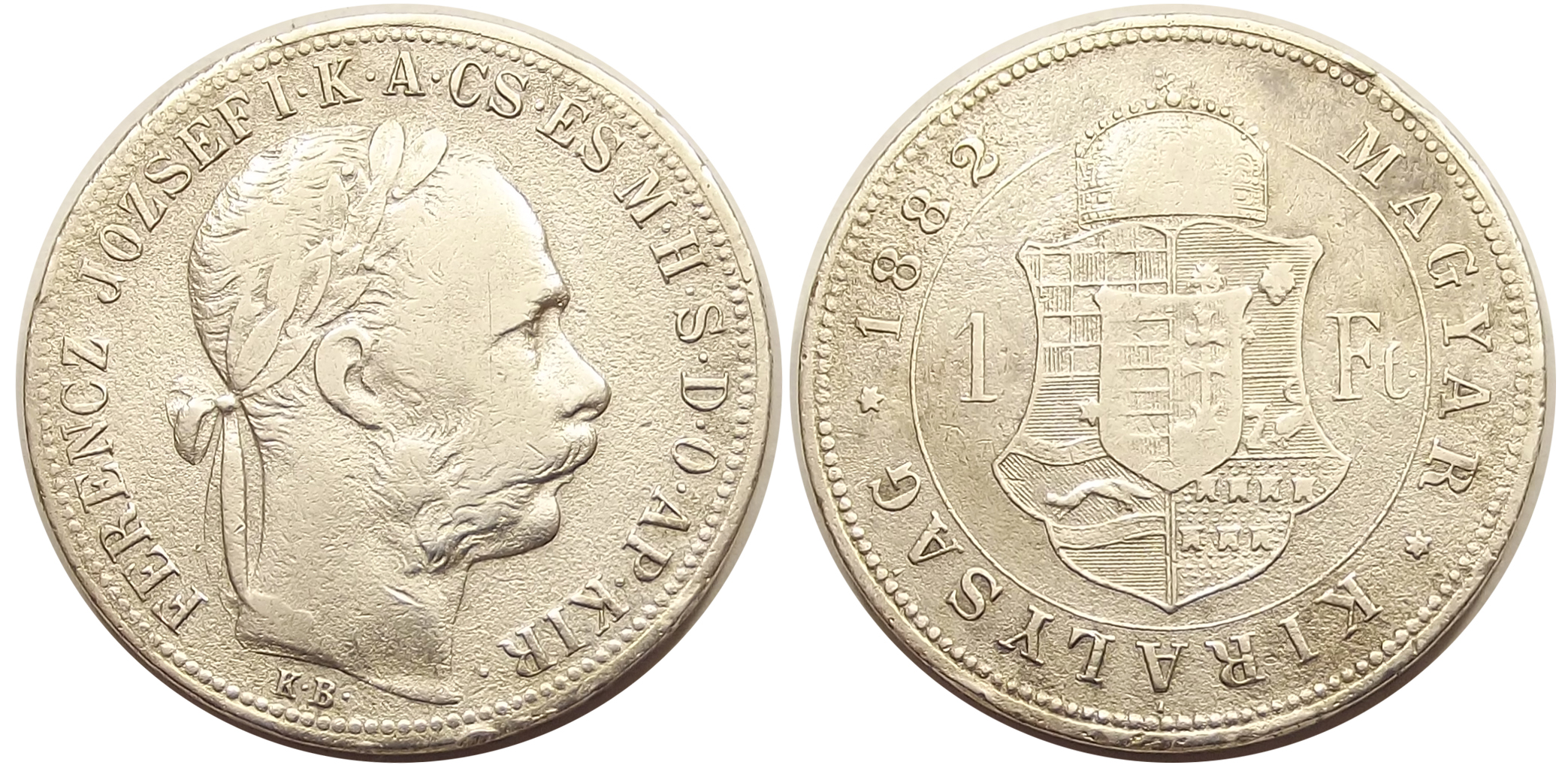 1 forint 1882 Ferenc József, ritka évjárat. Az érme felülete “grízes”, feltehetően kezelve lett valamivel. (szm