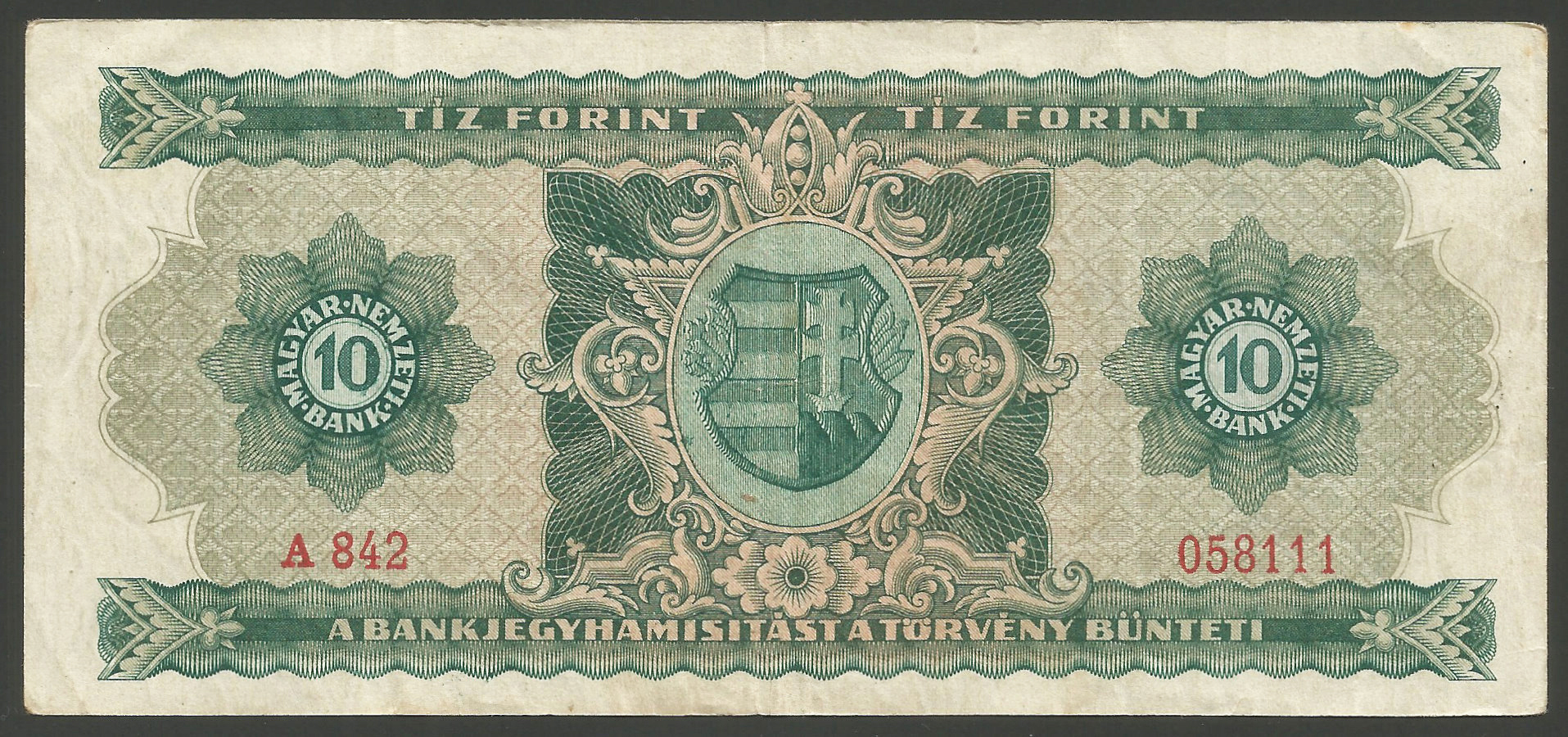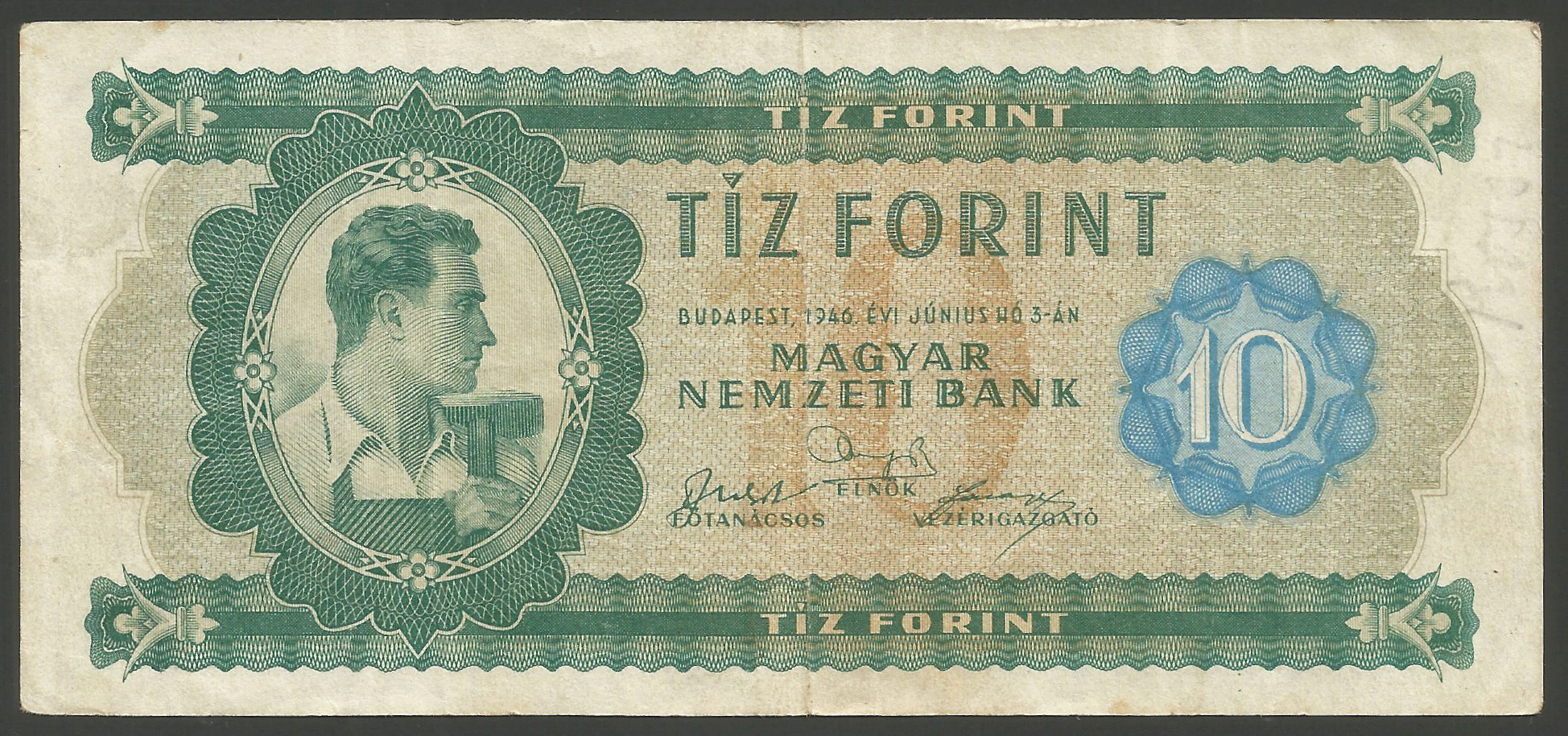 10 forint 1946 nagyon szép, eredeti állapotban. Egy erősebb és 3-4 gyenge függőleges hajtás, ropogós papír. Jobb oldalon firkálás (ceruza) (lsz