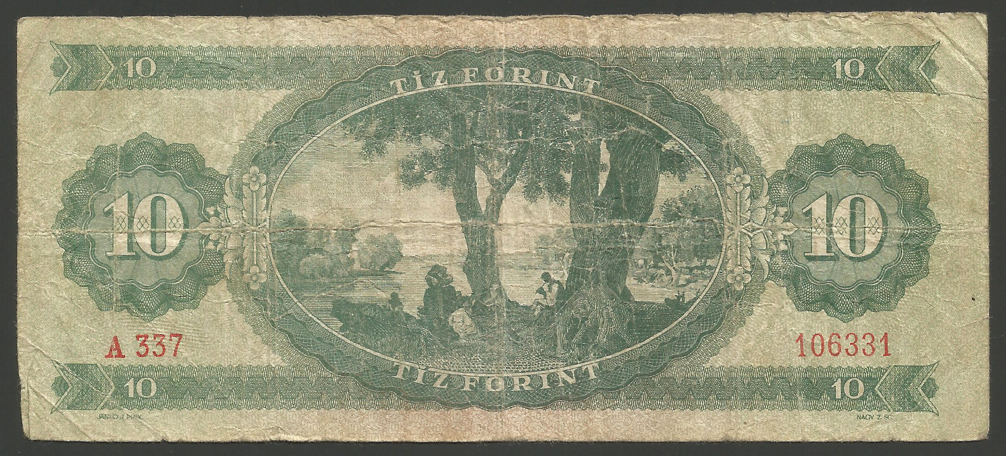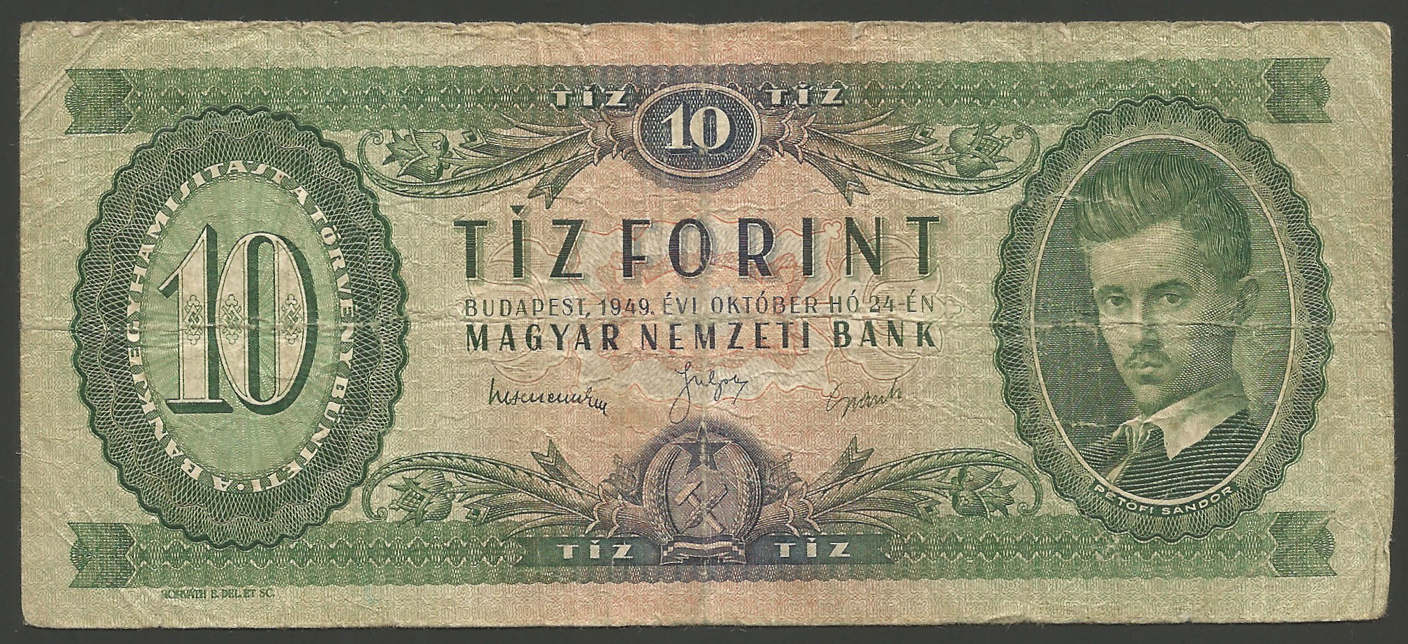 10 forint 1949, eredeti használt állapotban, sok hajtással, gyűrődésekkel, apró tűlyuk (tel