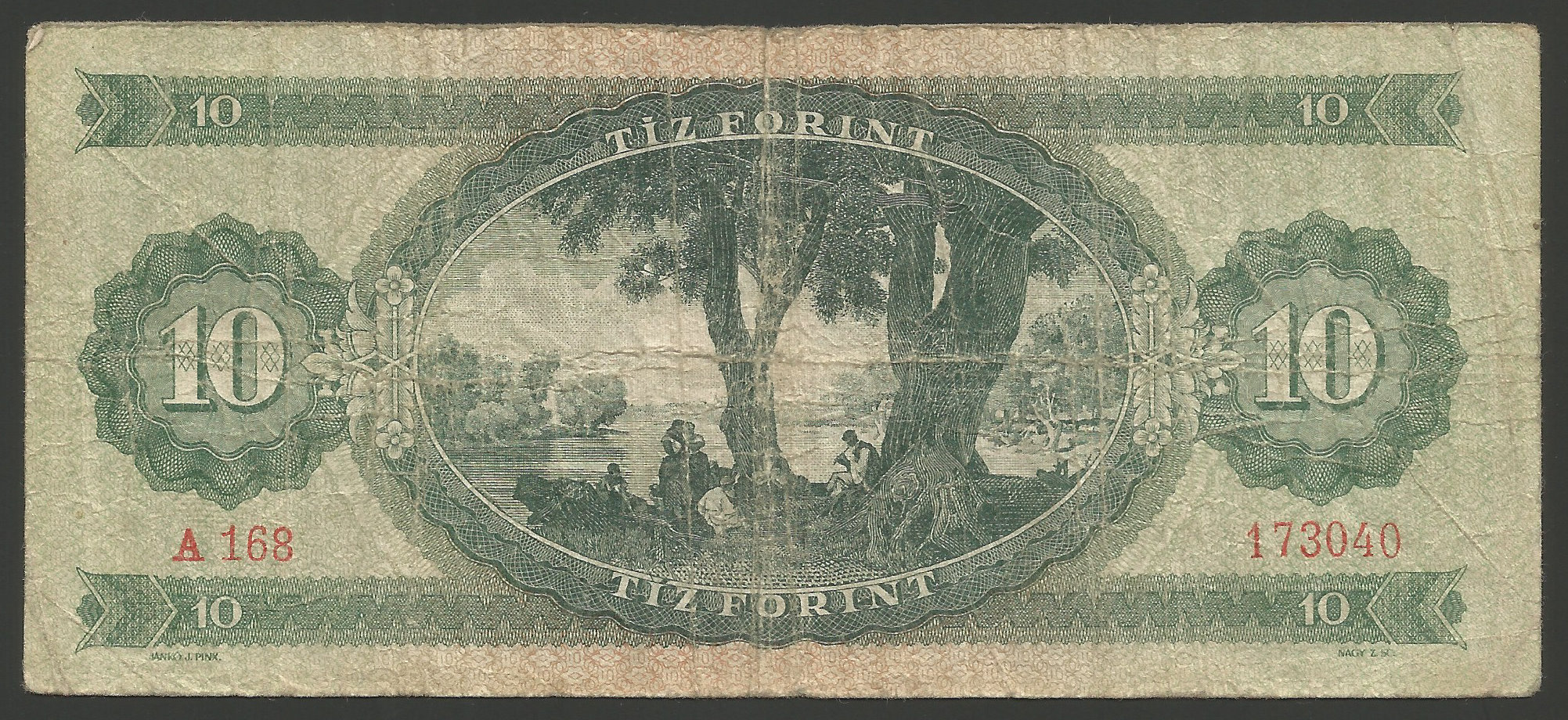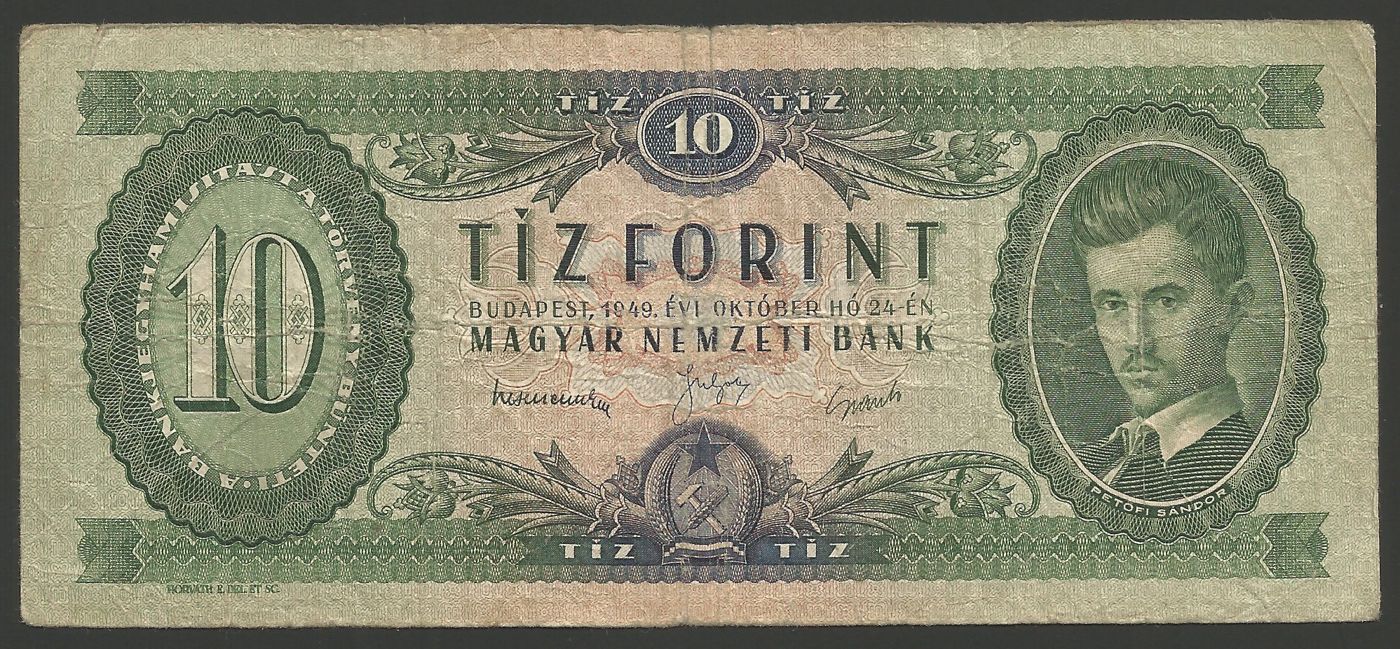 10 forint 1949, eredeti használt állapotban, sok hajtással, gyűrődésekkel, apró tűlyuk (tel