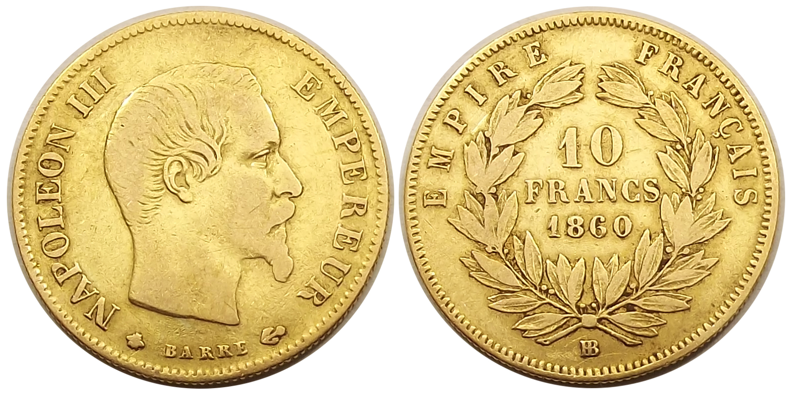 10 francs 1860 BB III. Napóleon Franciaország, szép állapotban. (k