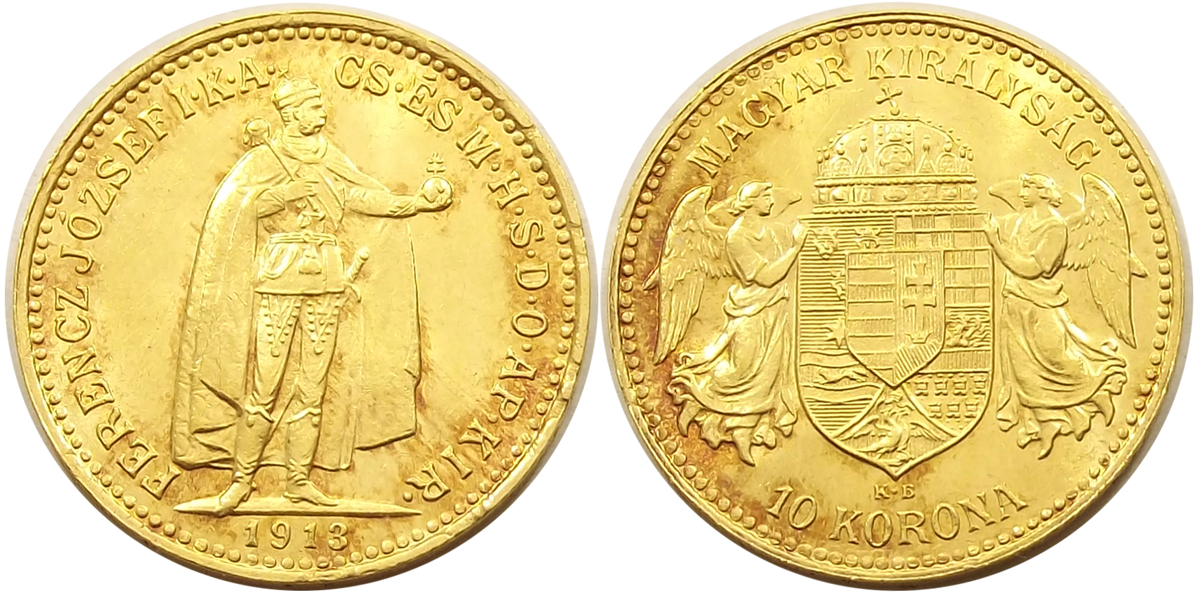 10 korona 1913 Ferenc József extra állapotban, mindkét oldalon verdefénnyel, aranypatinával. Ebben a tartásban ritka darab (ga