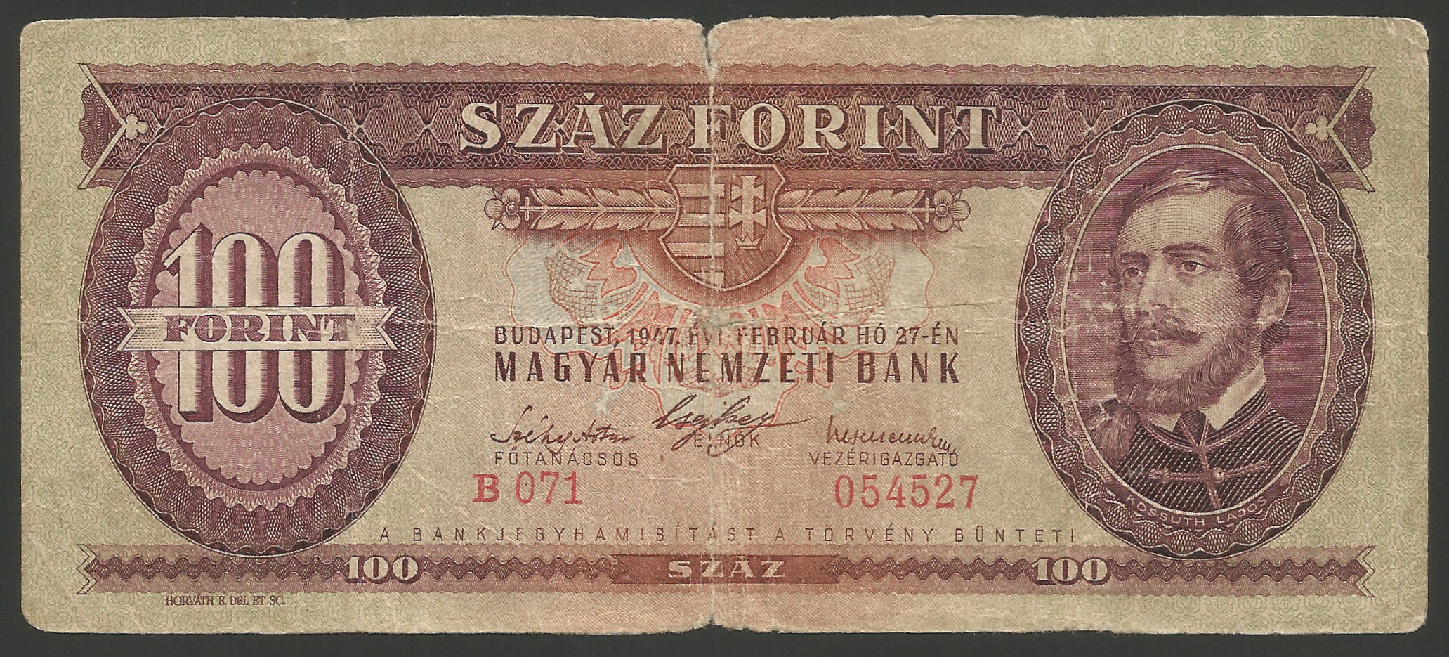 100 forint 1947 (Kossuth címer) eredeti, használt állapotban. (sf