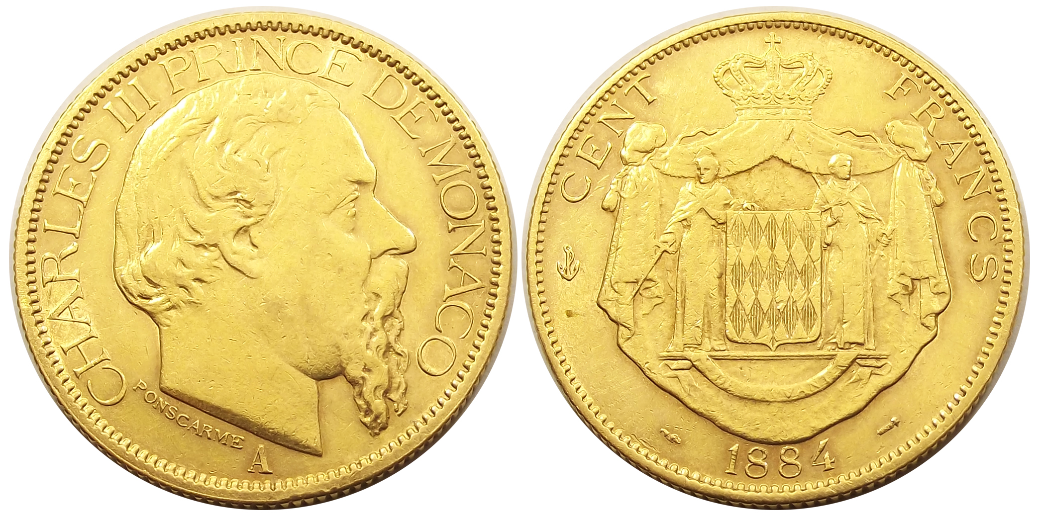100 francs 1884 Monaco nagyon szép állapotban, kivehető még az érme eredeti fénye. Portré oldalon 6 óránál apró peremhiba. Ritka darab, mindössze 15.000 példány készült.