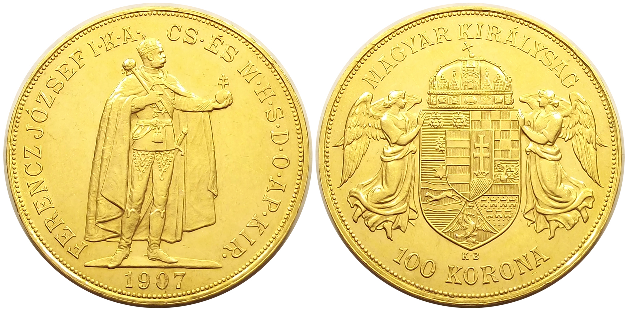 100 korona 1907 Ferenc József kiváló állapotban, éles portréval és címerrel, szép peremmel. Alapsíkon enyhe mikrokarcok. Ritka darab, mindössze 1088 db készült.
