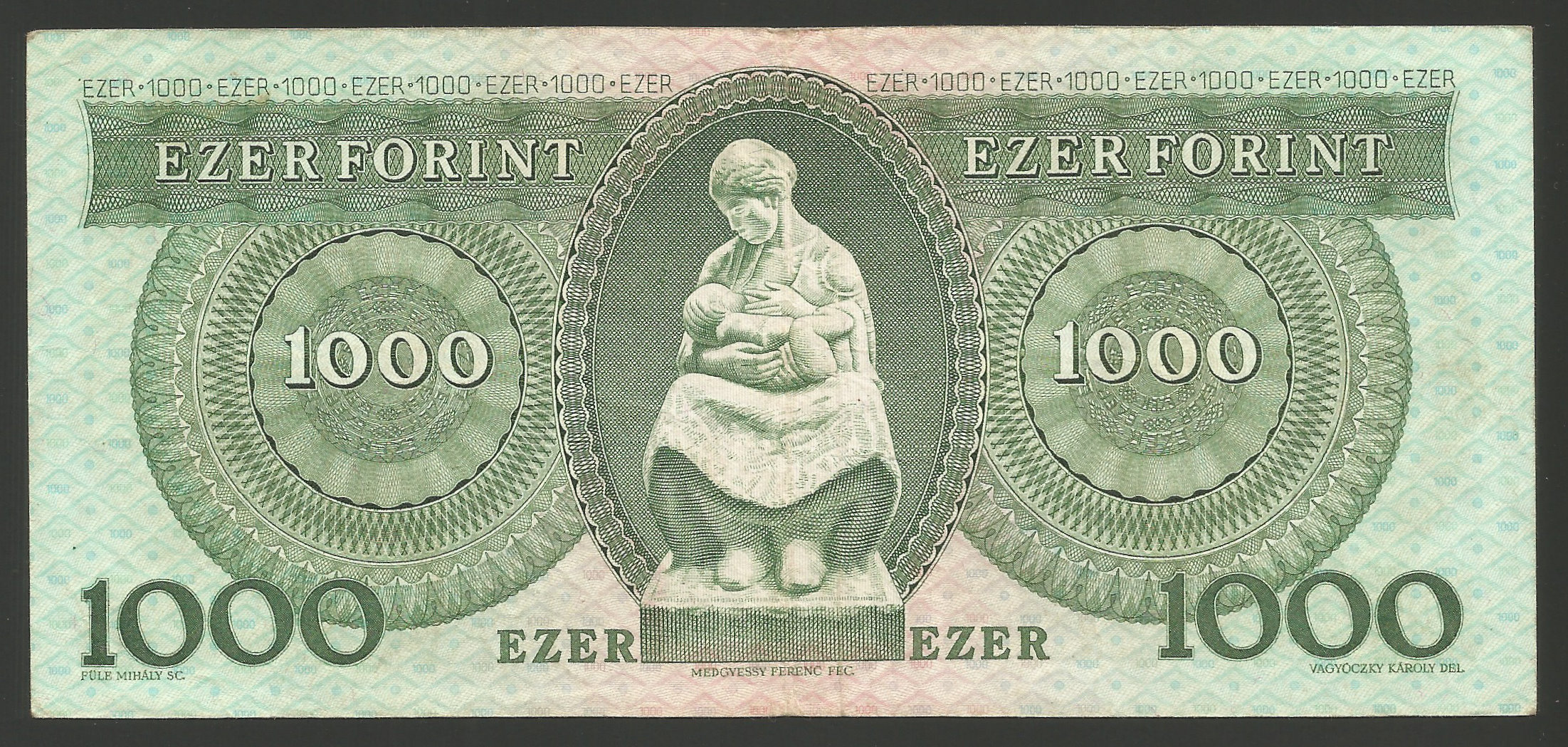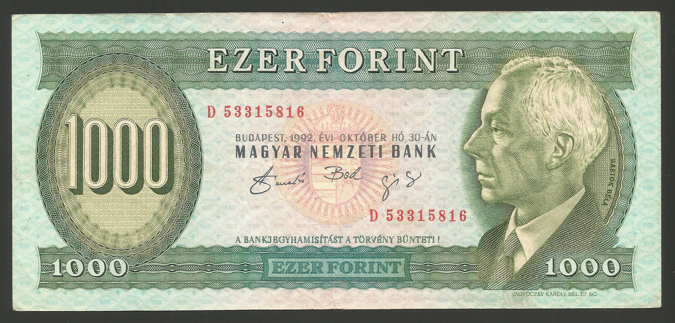 1000 forint 1992 D szép állapotban, több hajtással, apró gyűrődésekkel (bp