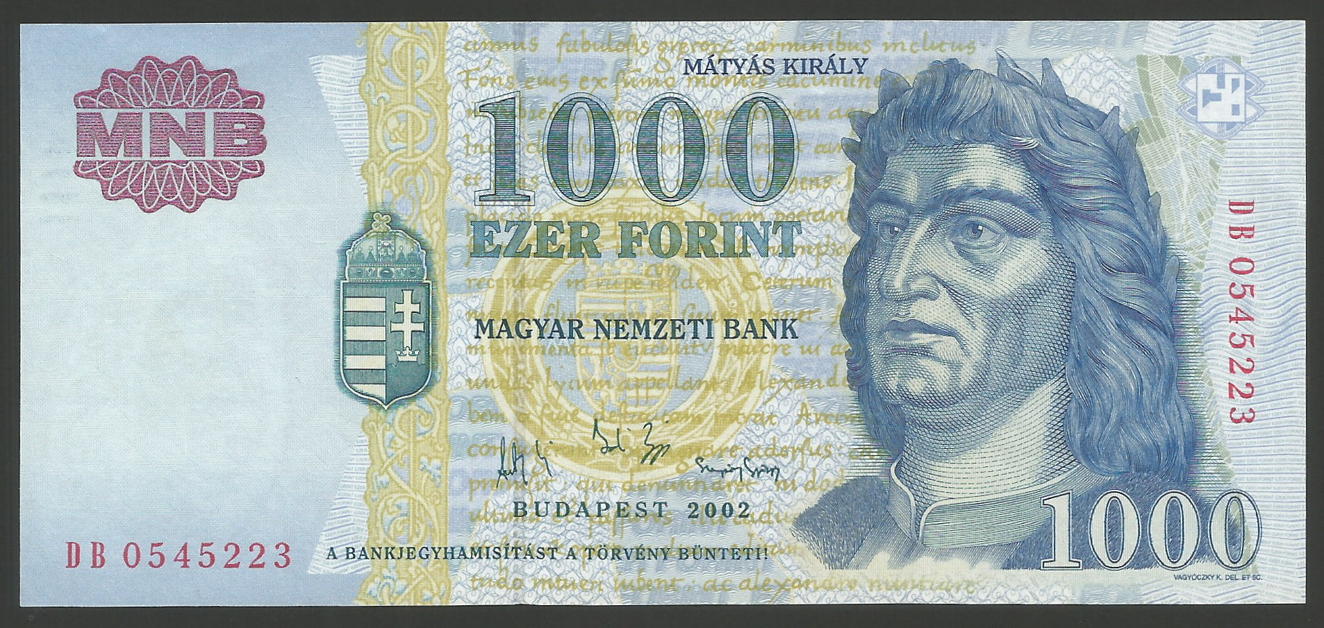 1000 forint 2002 DB hajtatlan állapotban, egészen minimális gyűrődés a papíron (sf