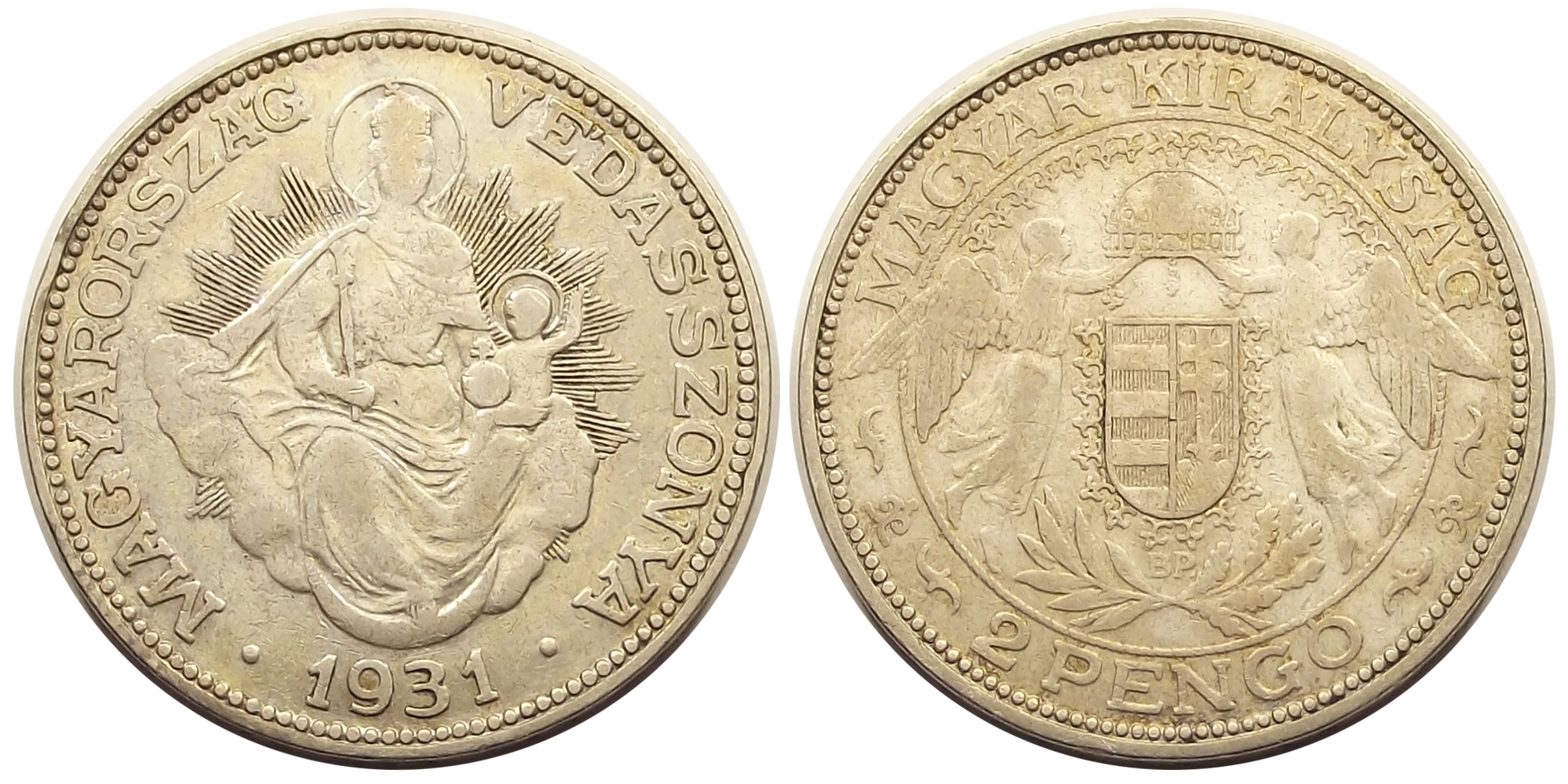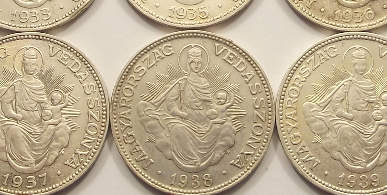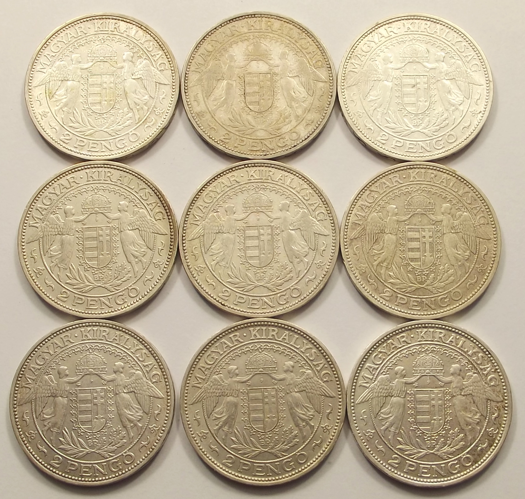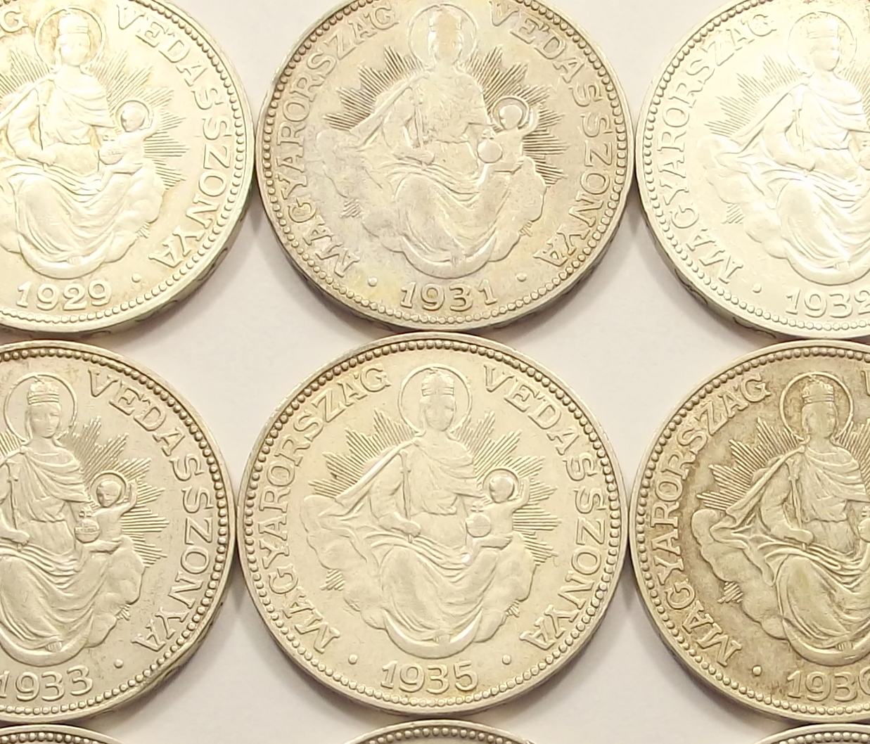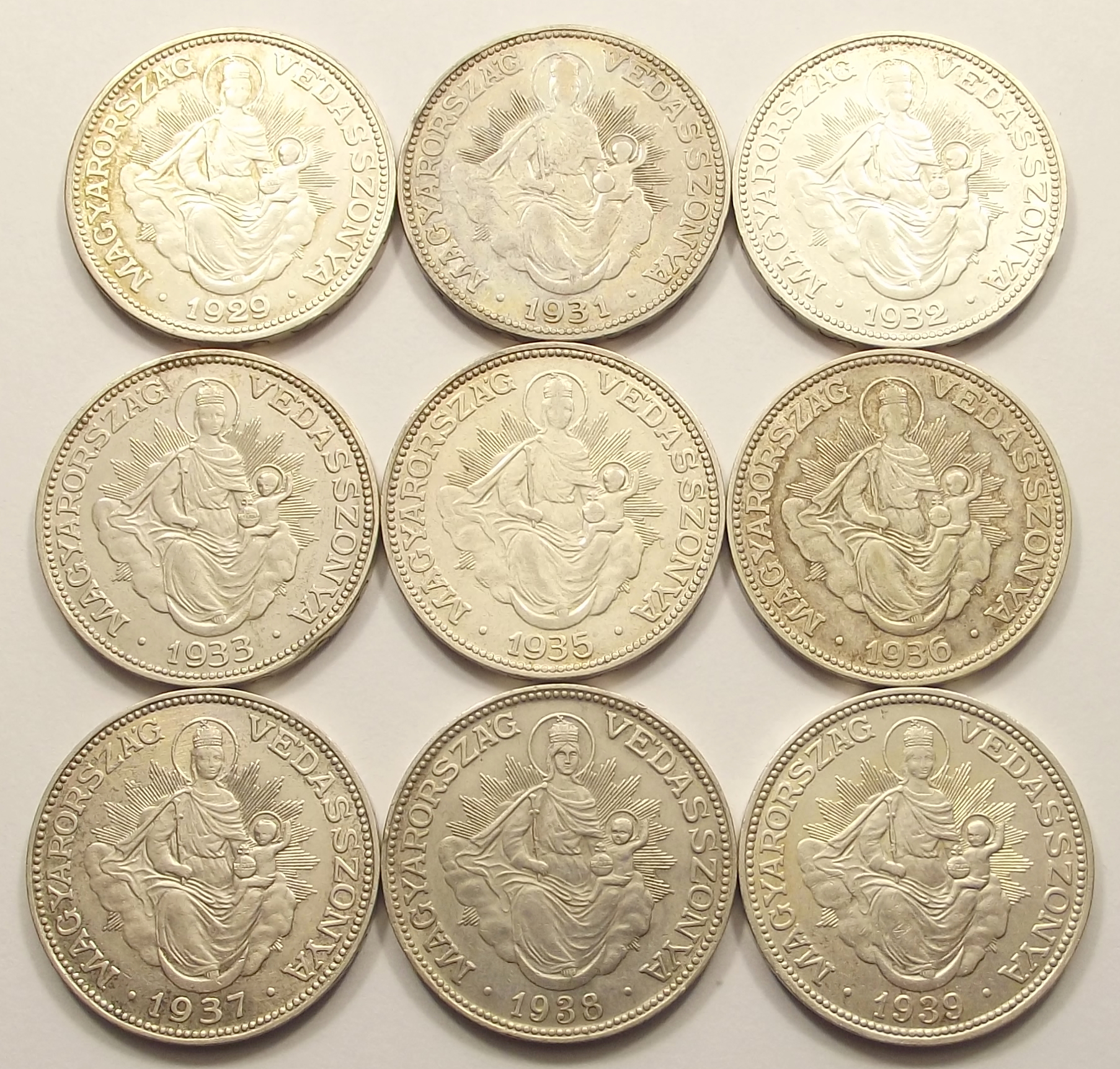 Madonnás ezüst 2 pengő sor 1929-39 Magyar Királyság, szép állapotú darabokkal, benne a ritka 1935-ös és 1931-es évjárat. (kt