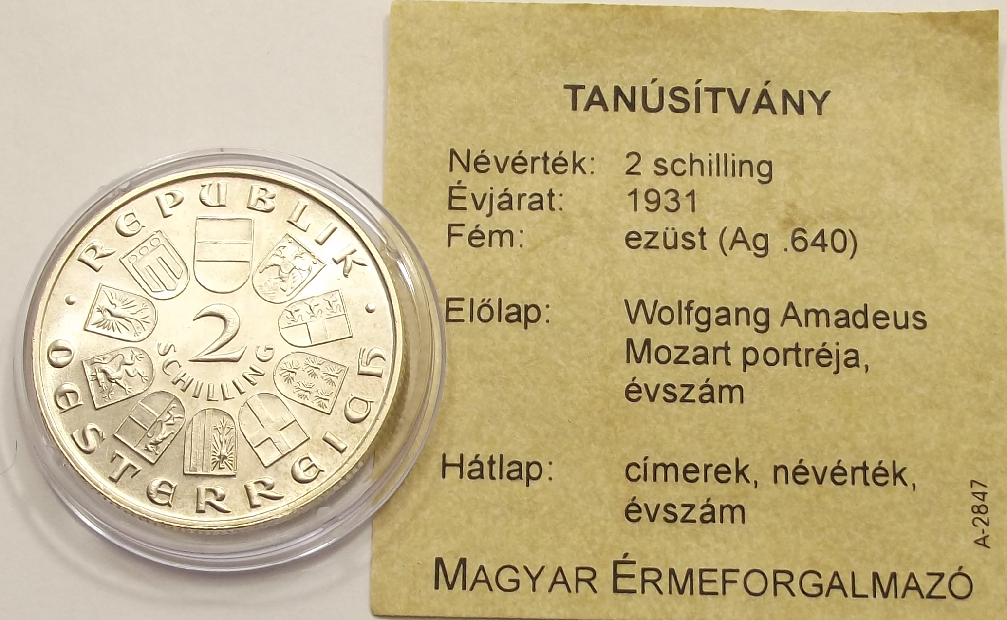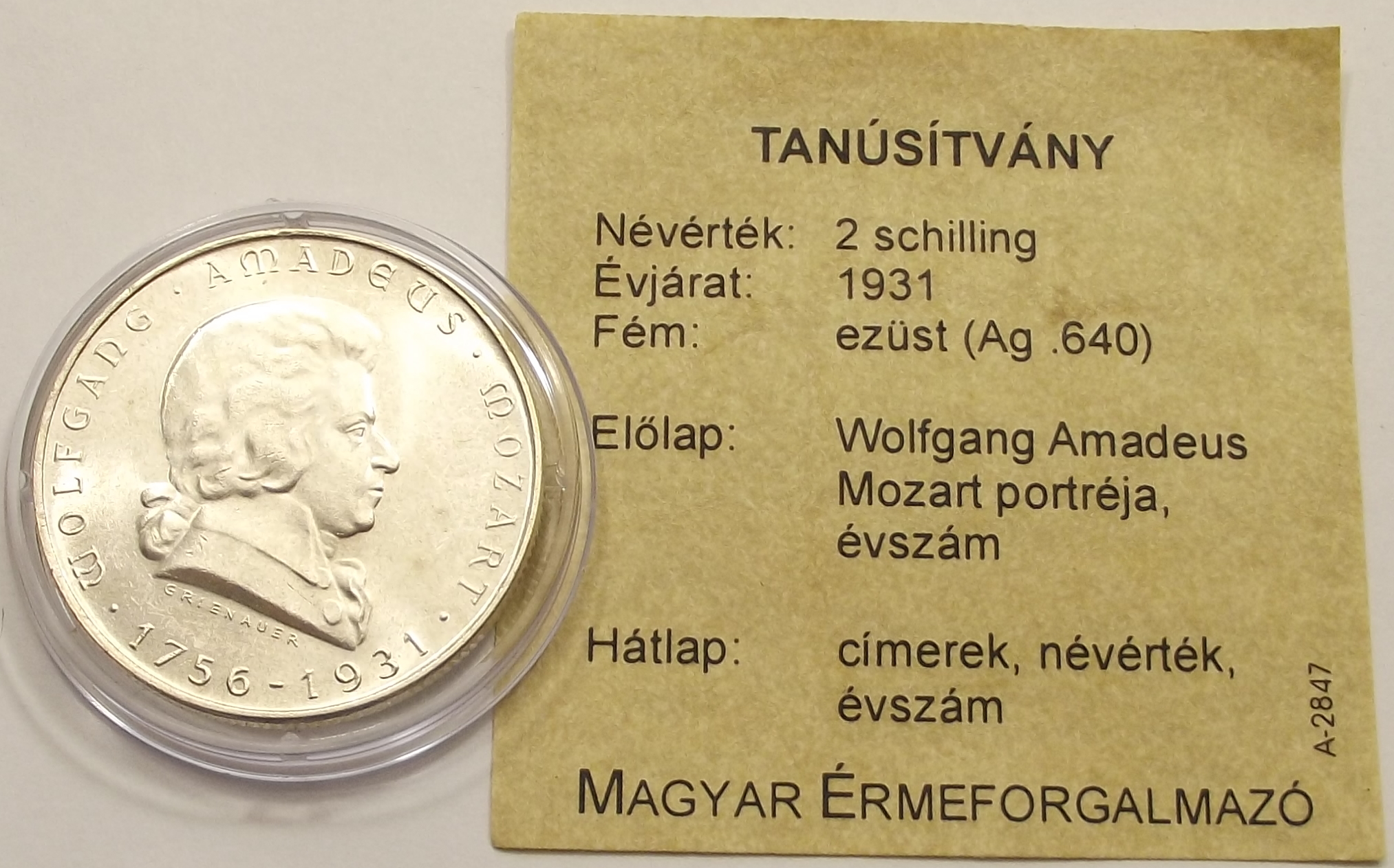 2 schilling 1931 Ausztria – Wolfgang Amadeus Mozart kiváló tartásban, certificate-el. (csm