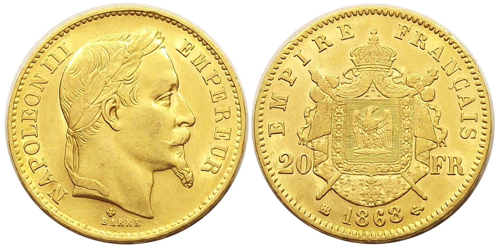 20 francs 1868 BB Franciaország nagyon szép állapotban, eredeti fénnyel (csp