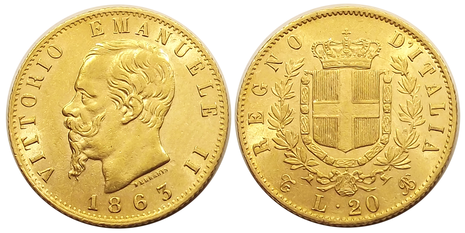 II. Viktor Emanuel arany 20 líra, kiváló állapotban.