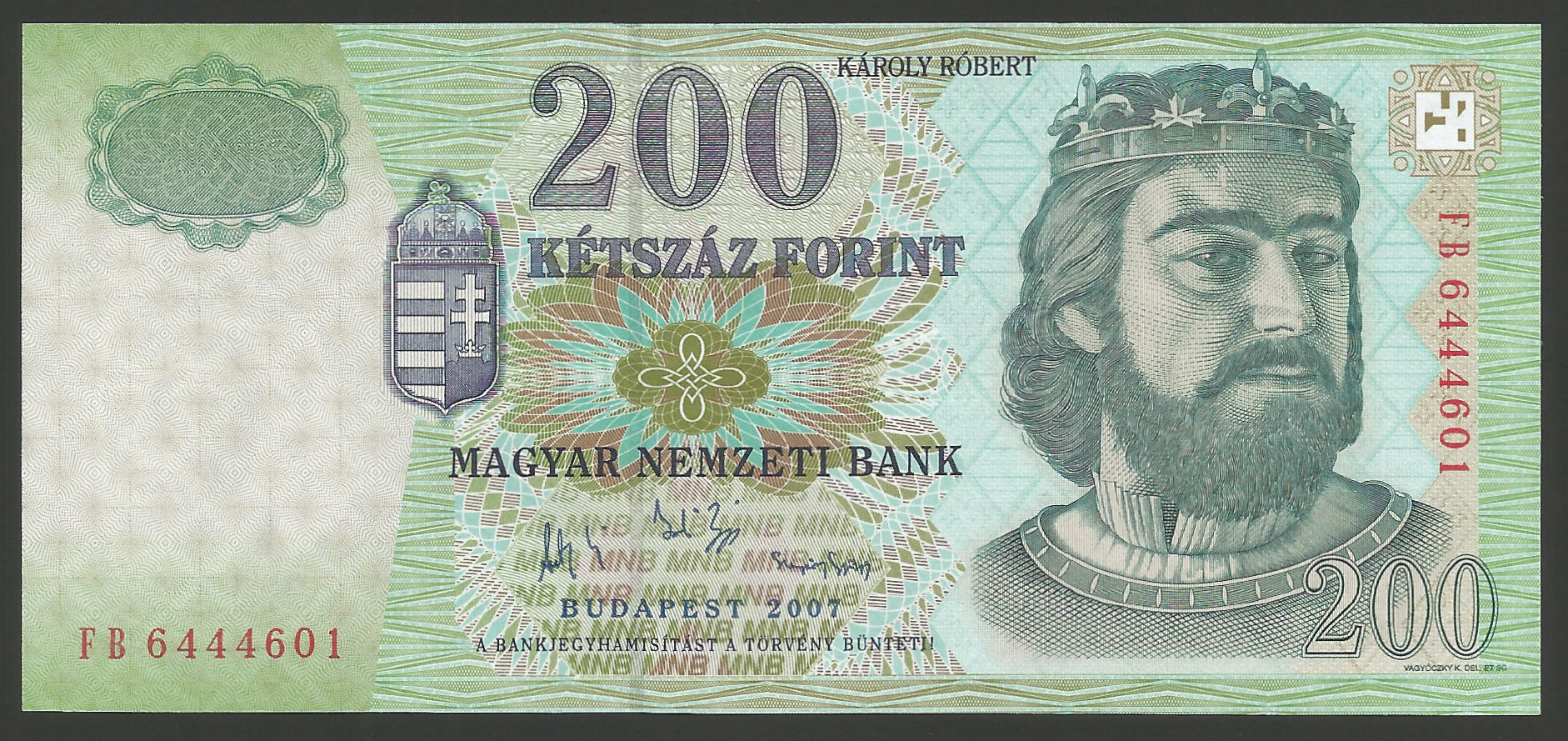 200 forint 2007 FB kiváló állapotban, enyhe hajtás a bankjegy jobb szélén (sf