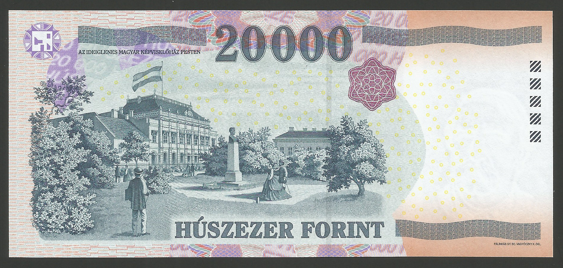 20000 forint 2009 GE hajtatlan állapotban. Enyhe vízszintes nyomódások a papíron, bankautomata nyoma. (sf