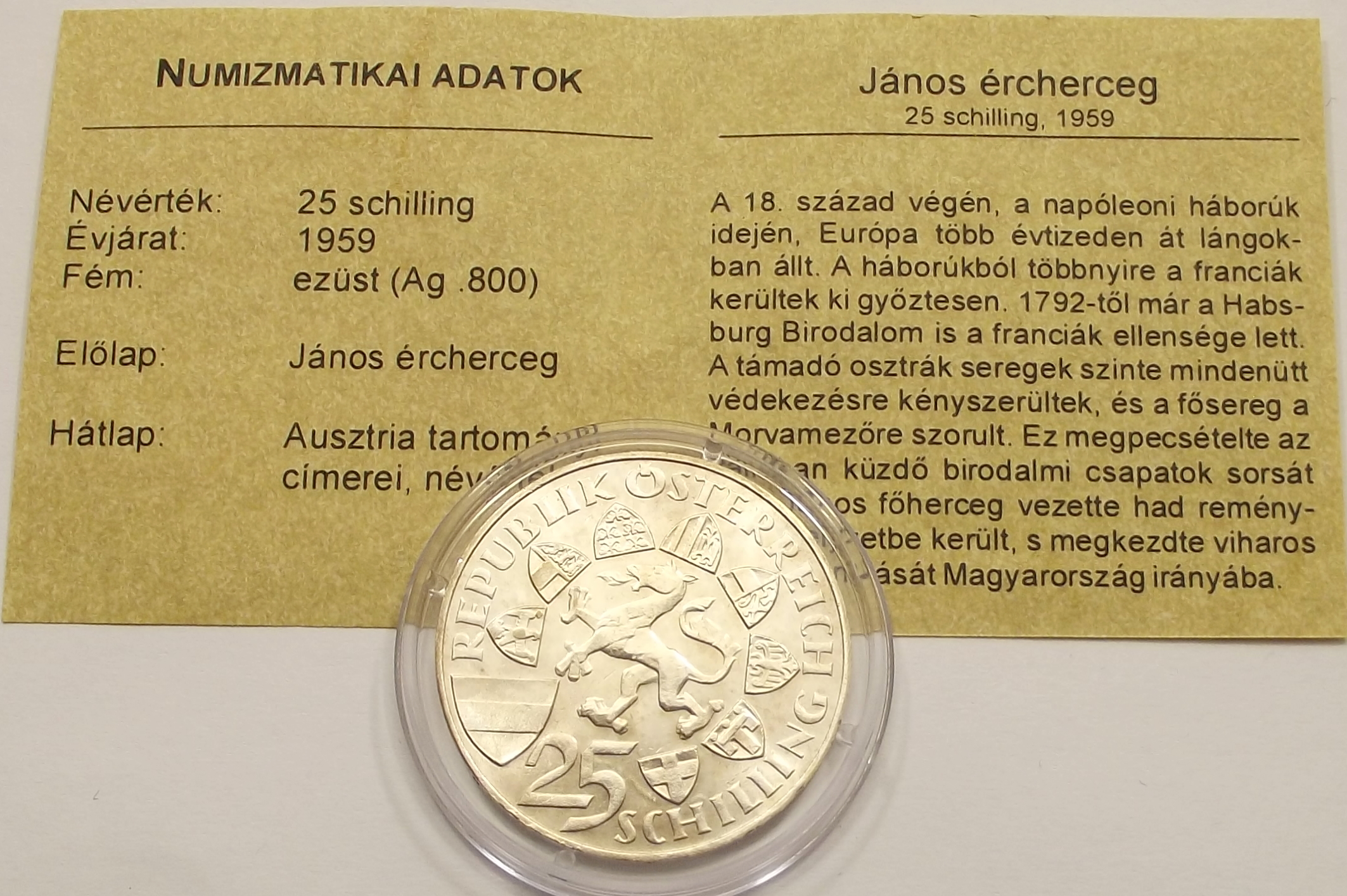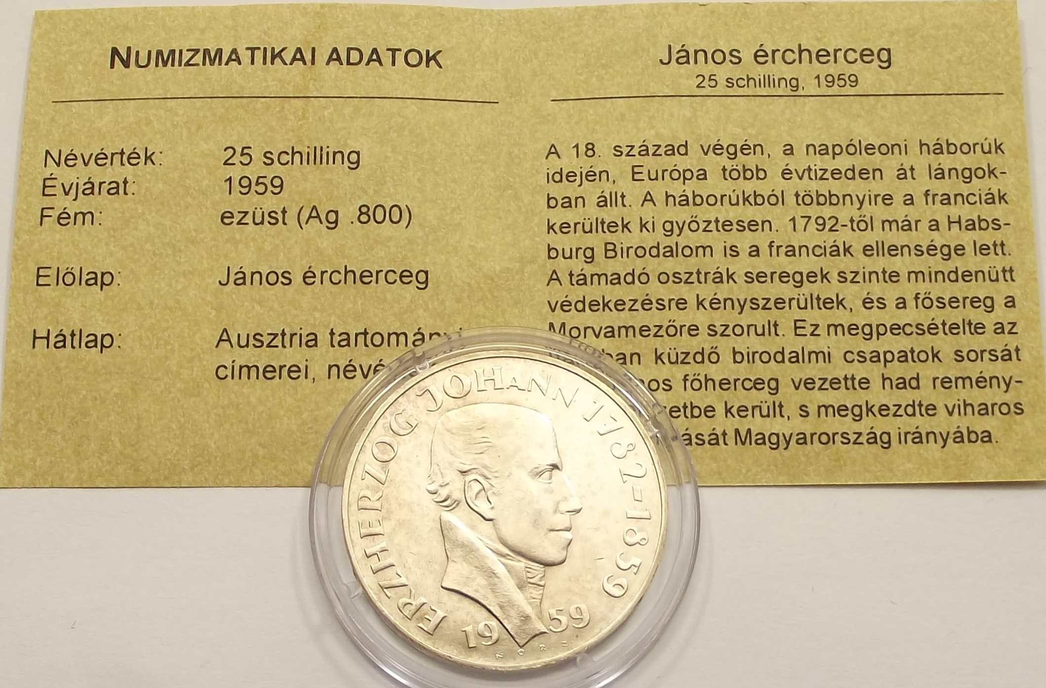 25 schilling 1959 Ausztria – János ércherceg kiváló tartásban, certificate-el. (csm
