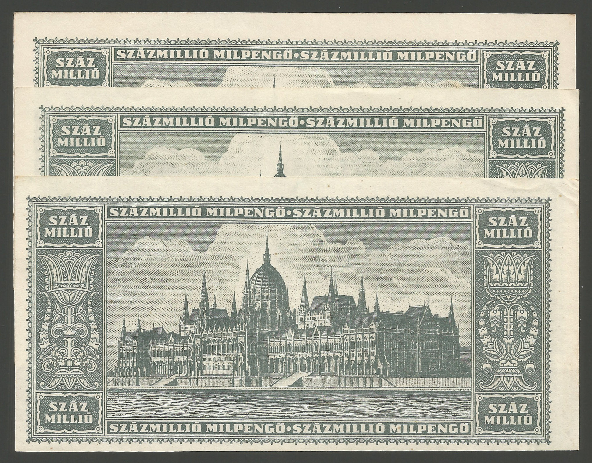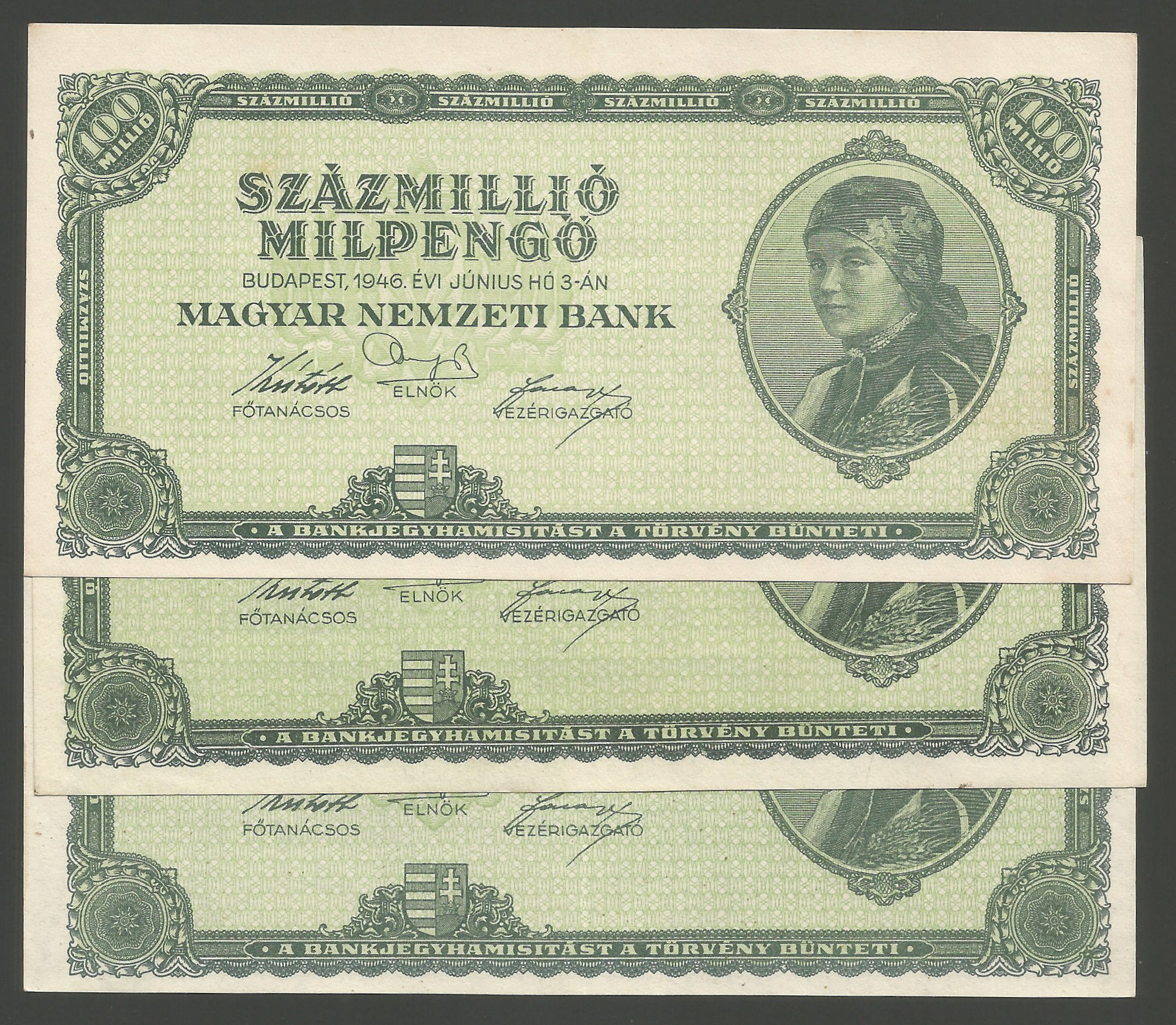 3 db 100 millió milpengő 1946 kiváló ropogós állapotban, az egyik darab hajtatlan (g a