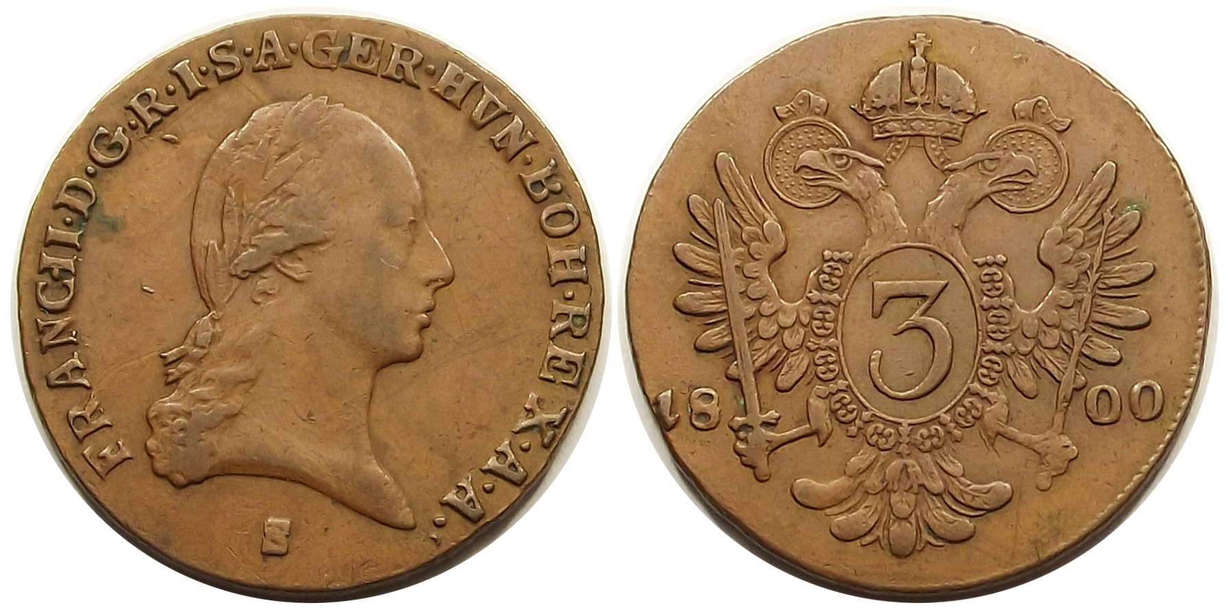 Réz 3 krajcár 1800 S I. Ferenc, nagyon szép állapotban. (os