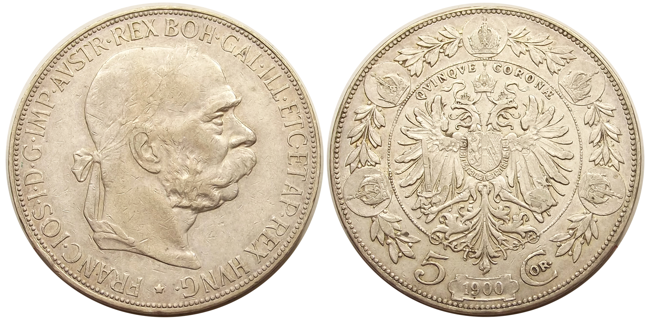 Ezüst 5 corona 1900 (osztrák típus), Ferenc József portréjával, nagyon szép állapotban (vl