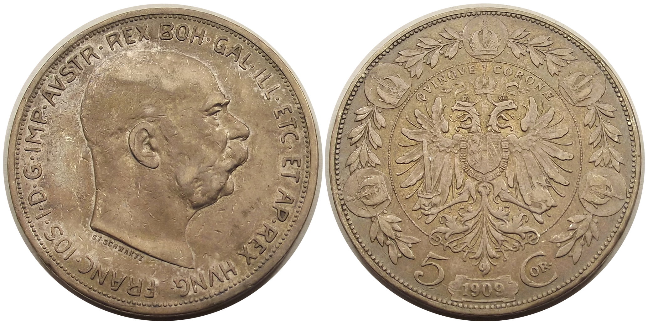 5 corona 1909 St. Schwartz (osztrák típus), Ferenc József portréjával, szép állapotban, patinával (gb