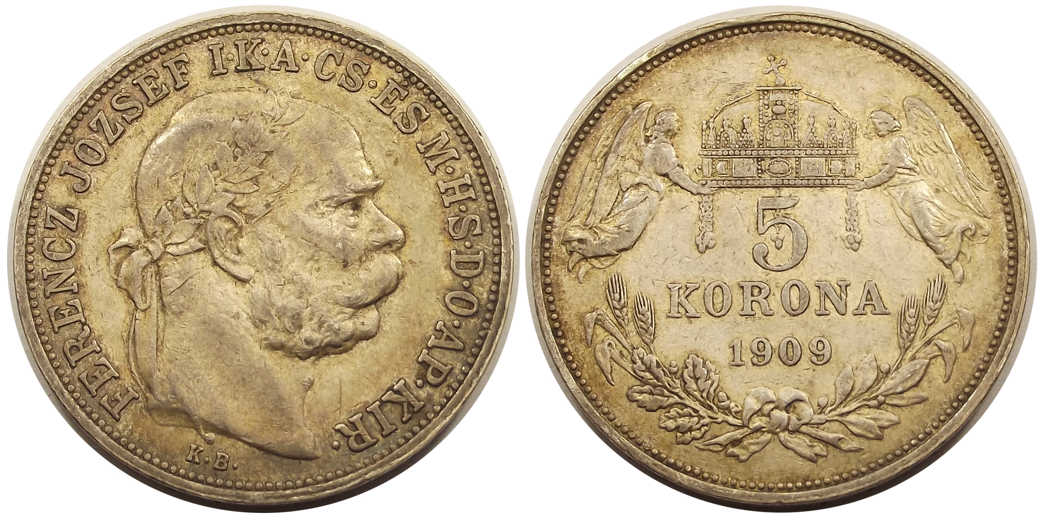 5 korona 1909 Ferenc József, nagyon szép állapotban, patinával (gb