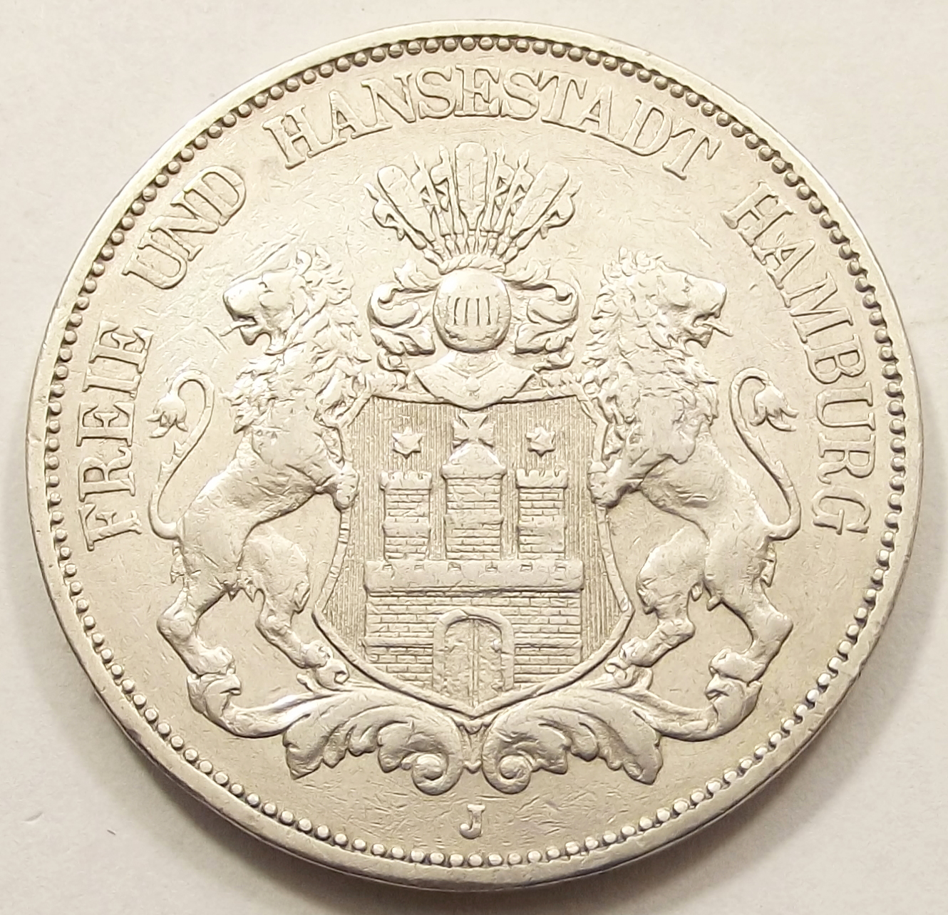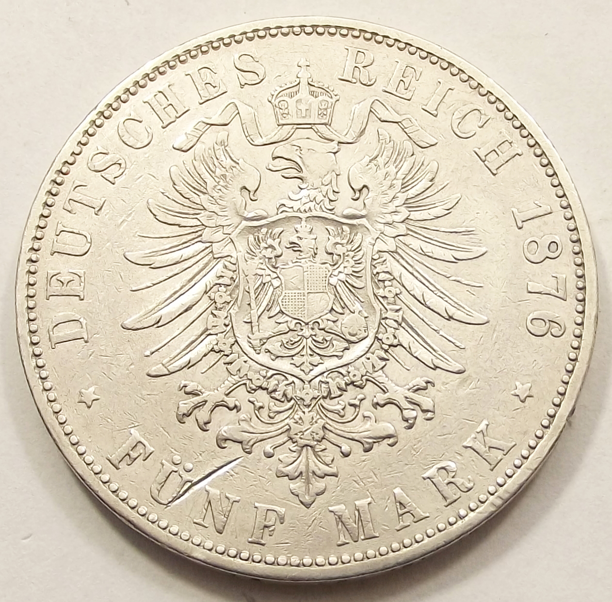 5 márka 1876 J Hamburg, nagyon szép tartásban, karc a mezőben (jt