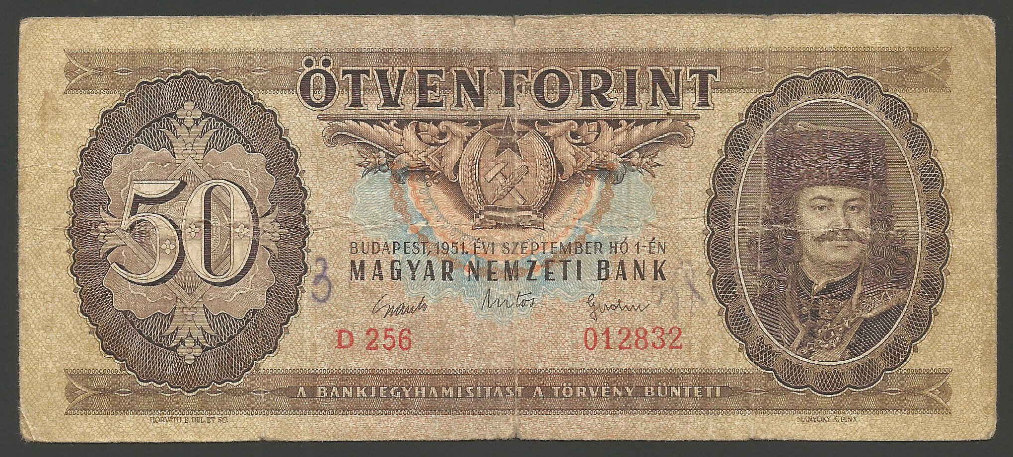 50 forint 1951 (Rákosi címer) eredeti, erősen használt állapotban. Ritka évjárat! (tel