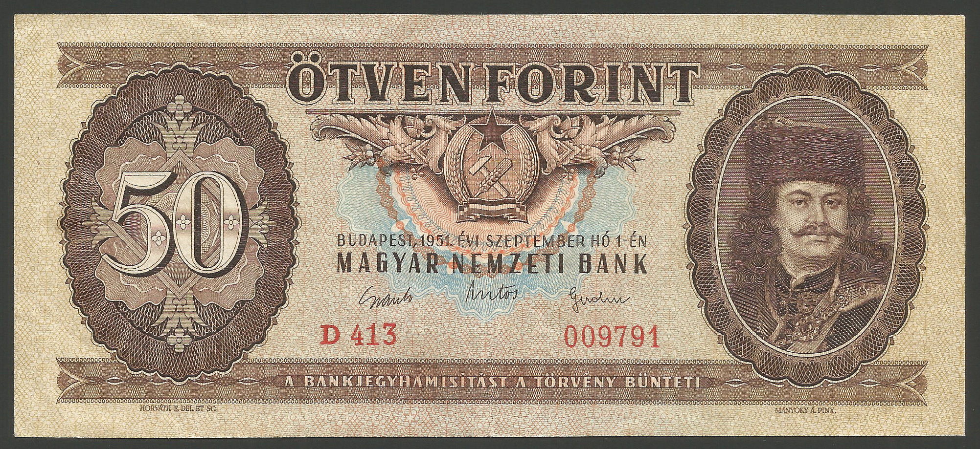 50 forint 1951 nagyon szép eredeti állapotban, hajtásokkal, erős papírral, eredeti tartásban (le