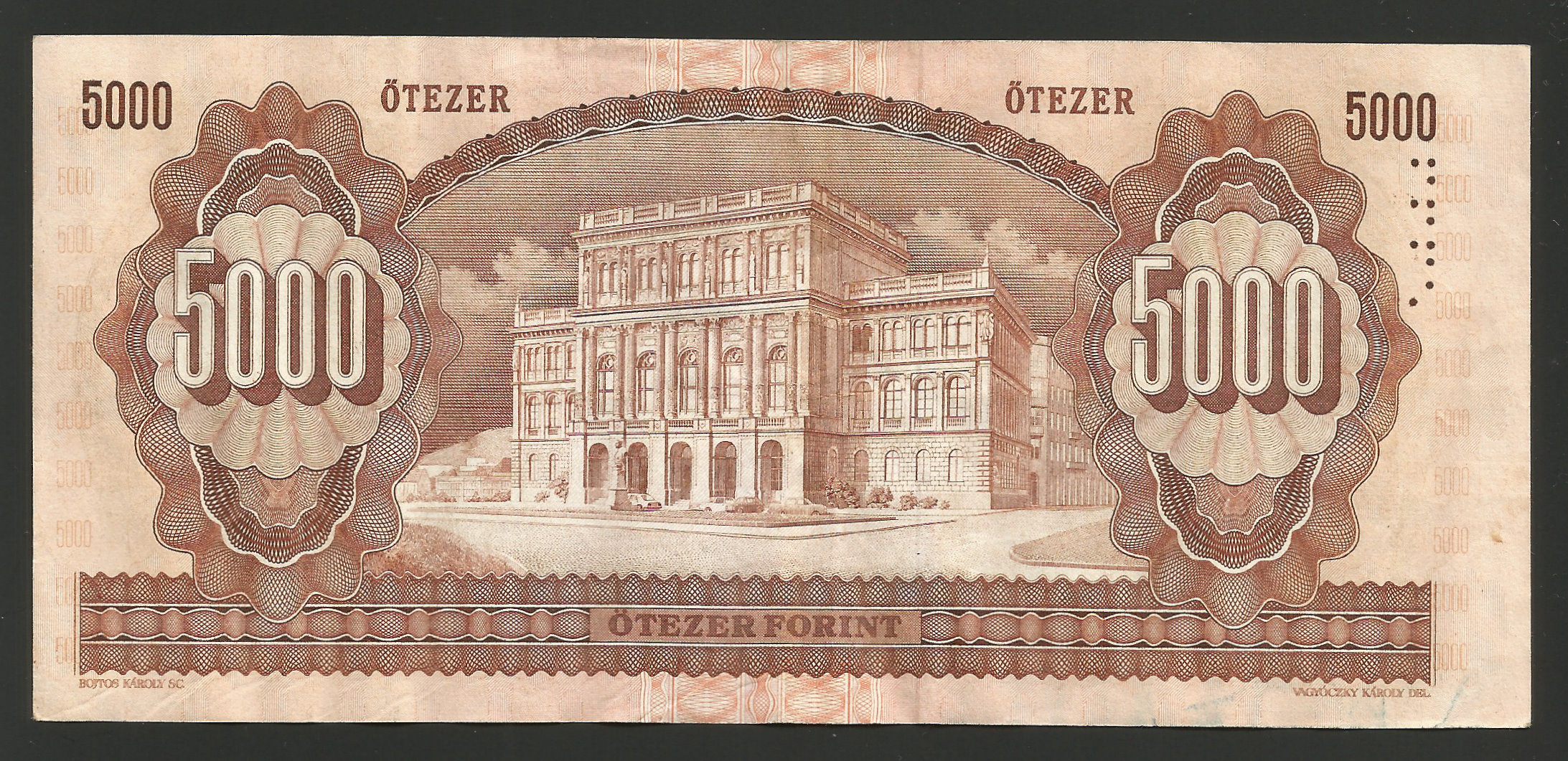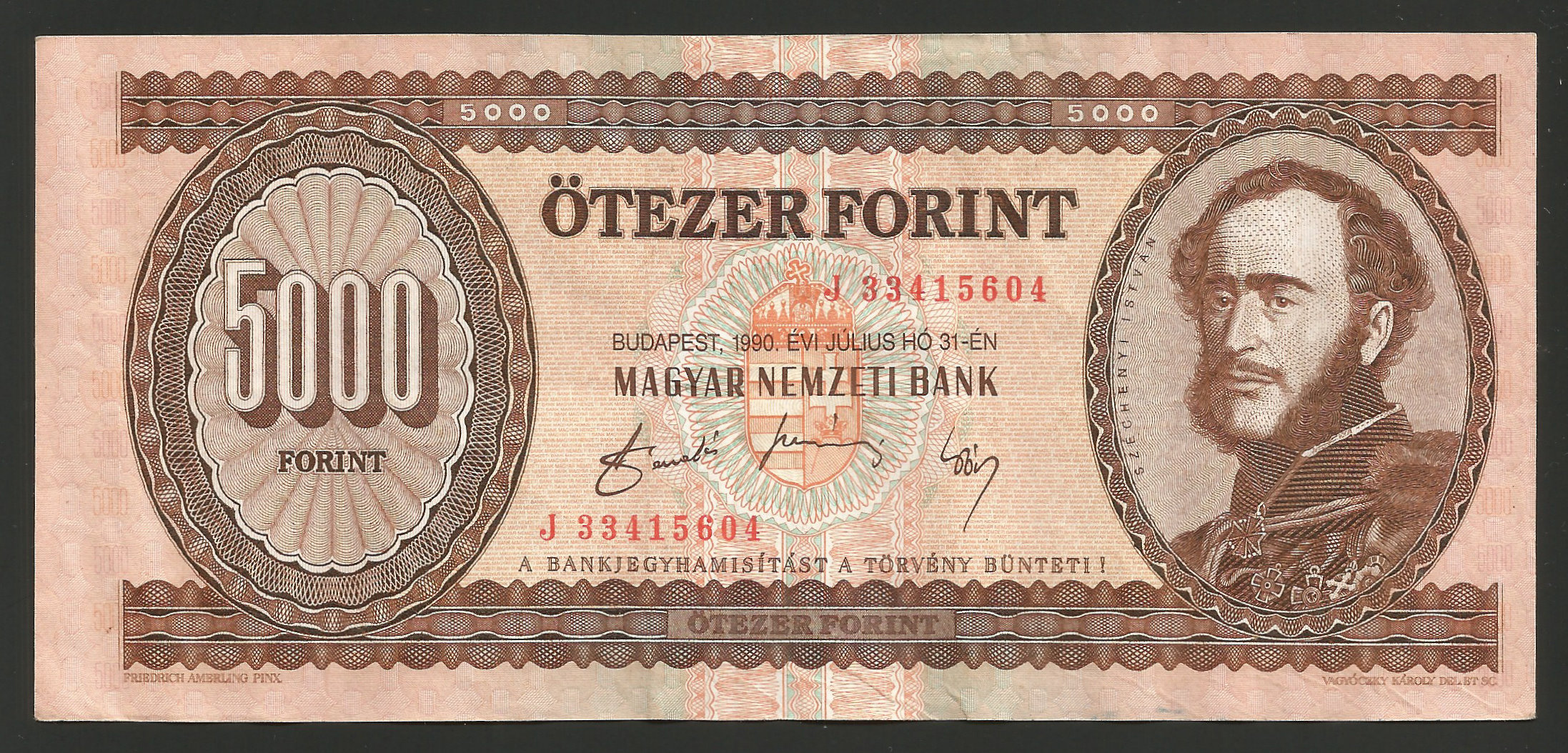 Széchenyi 5000 forint 1990 J, használt, eredeti állapotban, szép erős tartású papírral. Ritkább betűjel.