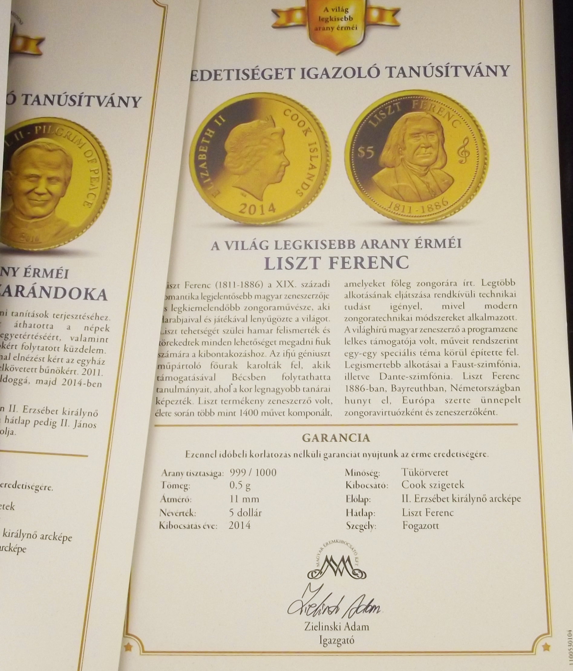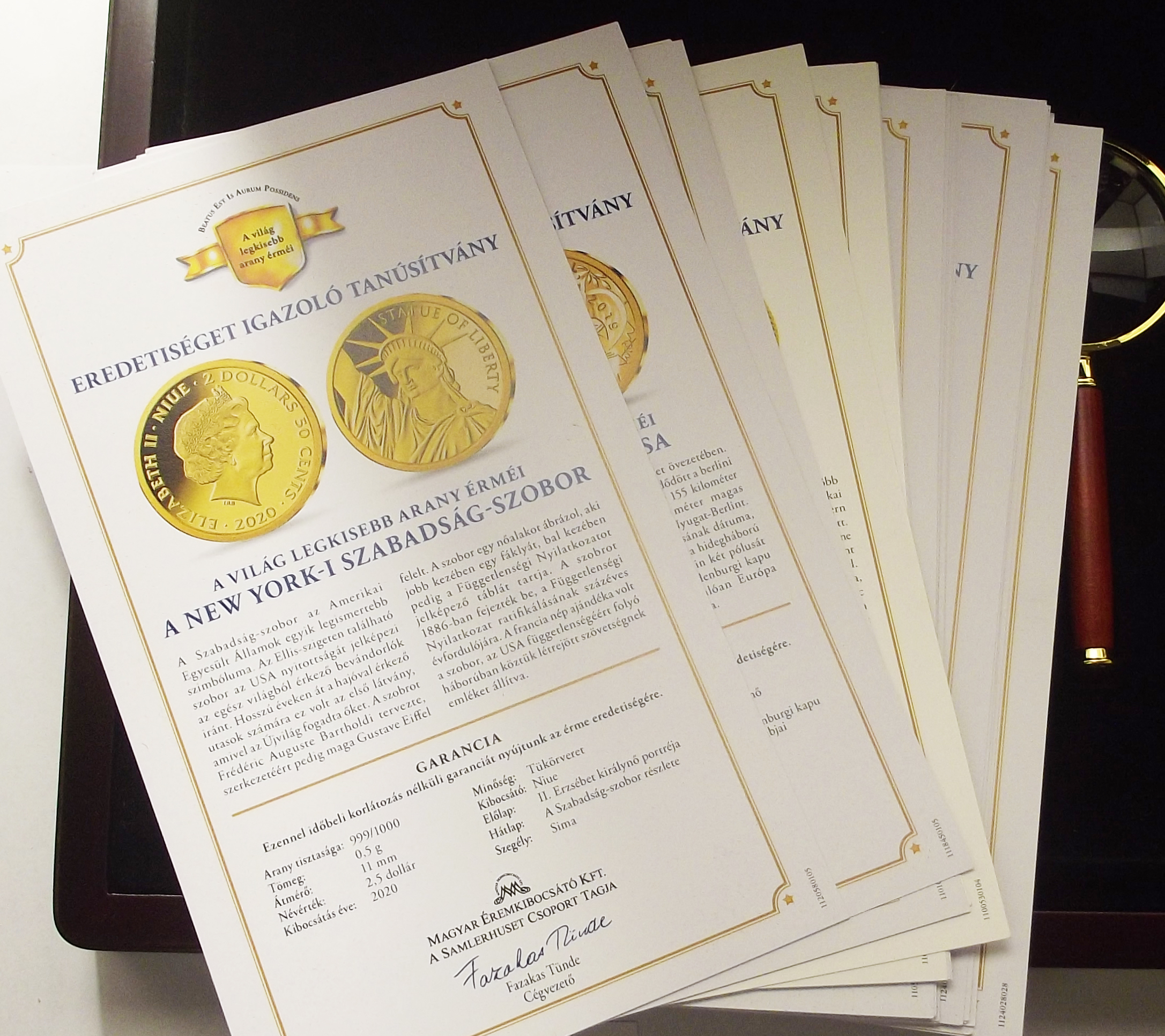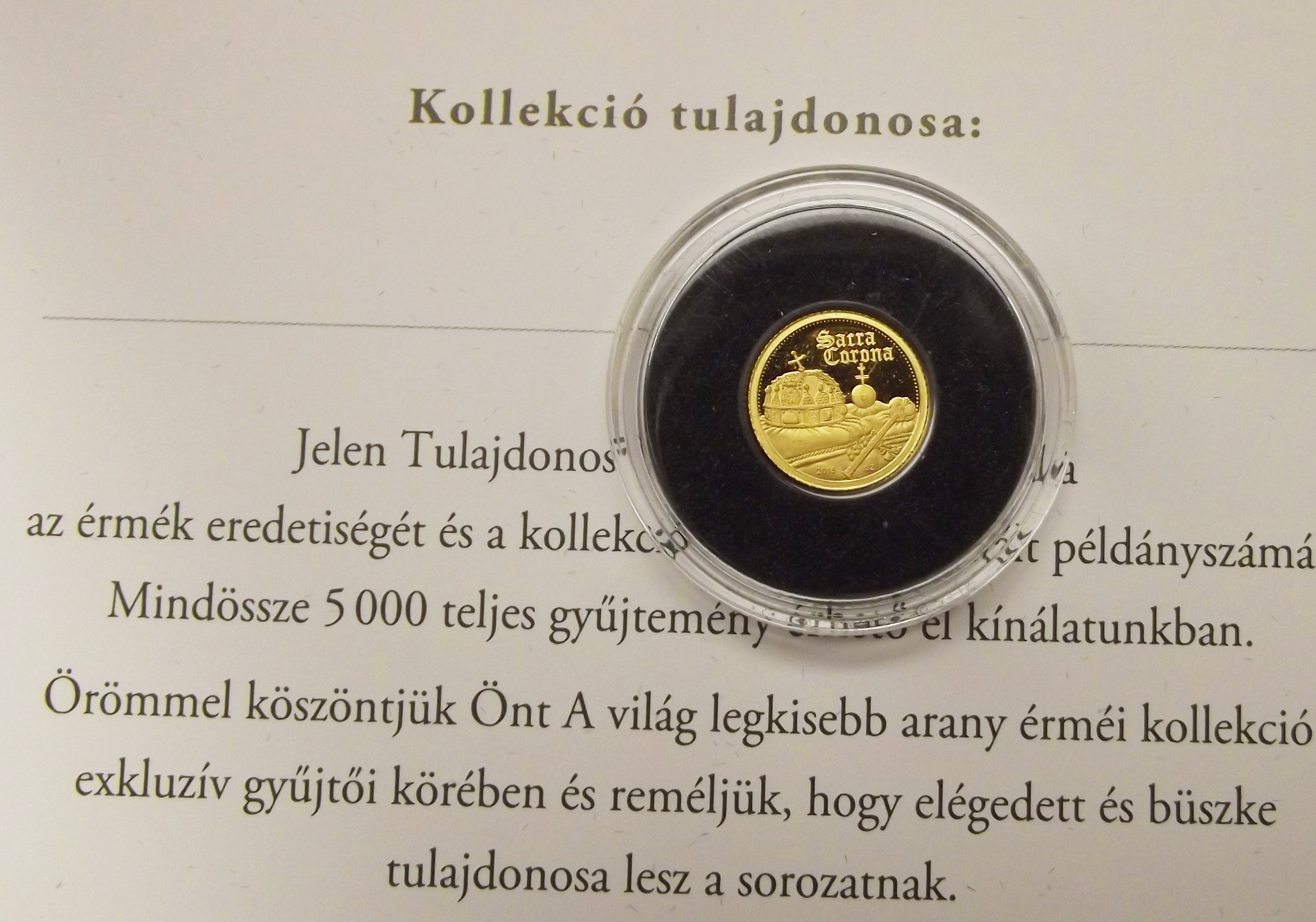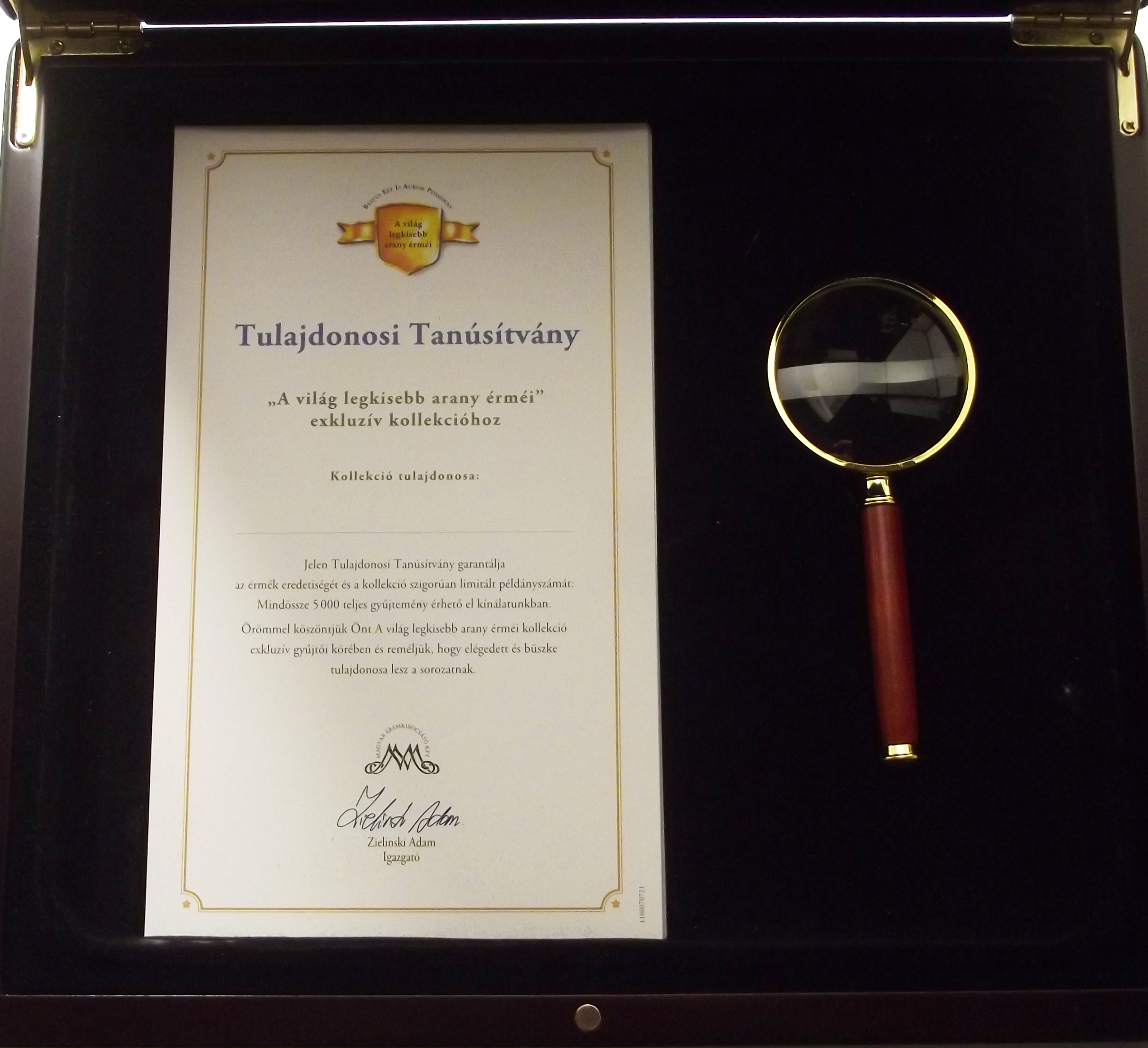 A világ legkisebb arany érméi kollekció, kiváló állapotban, mágnessel záródó díszdobozban, ajándék lupéval. A kollekció 23 db-ot tartalmaz, mindegyikük 0.5 grammos színarany (0.999) érme, certificate-el. Exkluzív kiszerelés, hibátlan színarany érmék a világ minden tájáról.