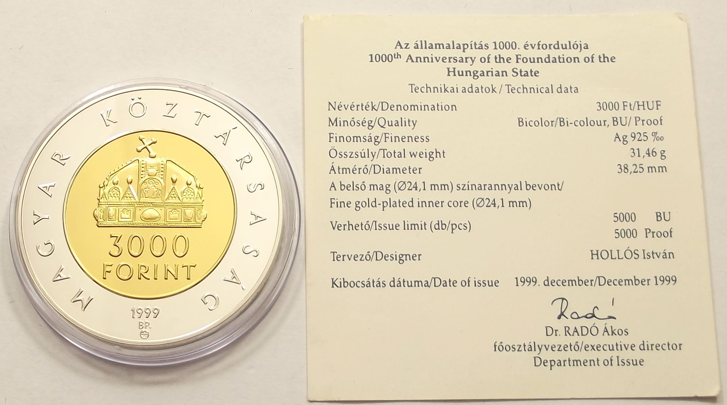 Államalapítás 3000 forint 1999 PP, kiváló állapotban, kapszulában, certificate-el (ti