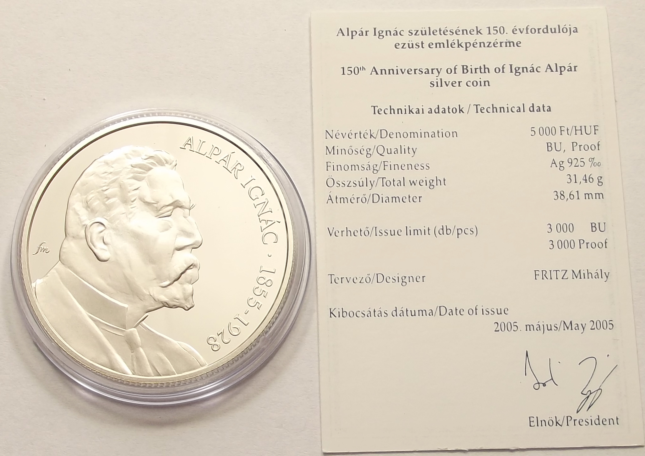 Alpár Ignác 5000 forint 2005 PP, kiváló állapotban, certificate-el (vl