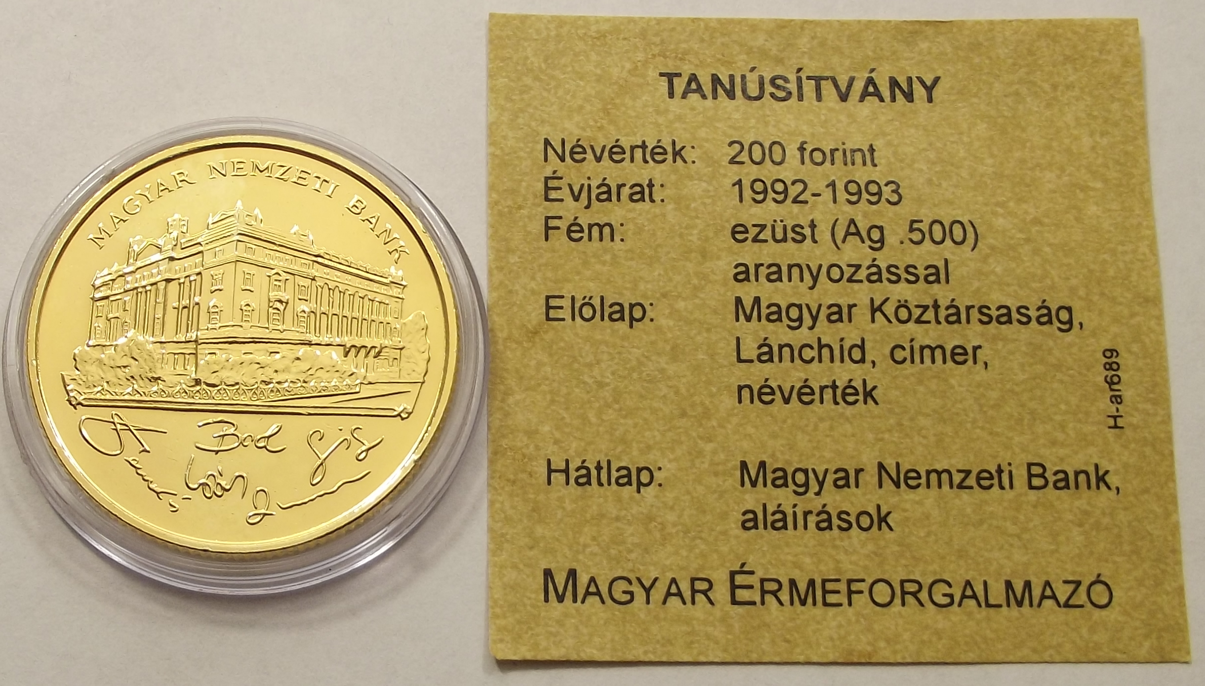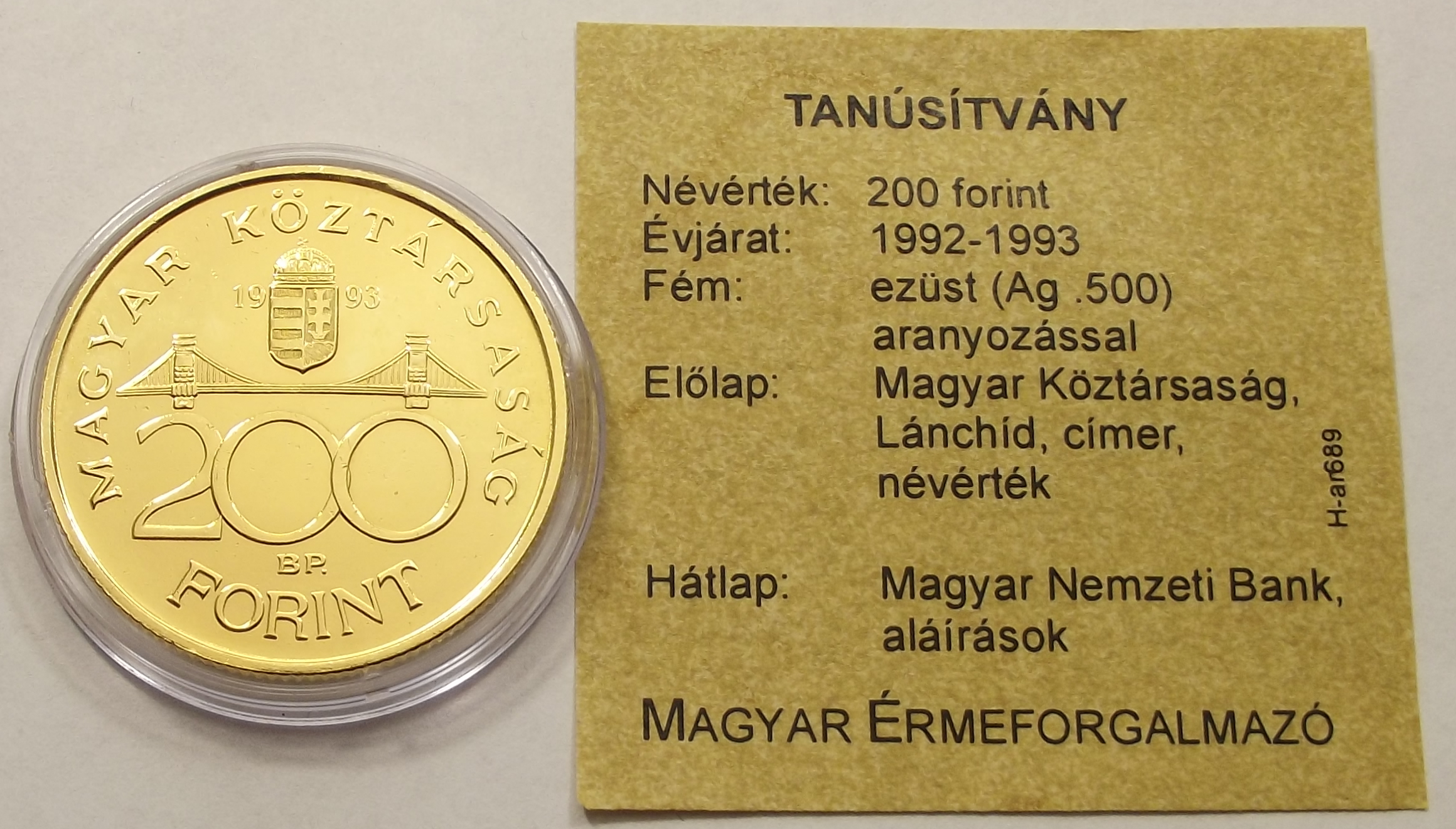 Aranyozott 200 Forint 1993, kiváló állapotban, certificate-el. (ti