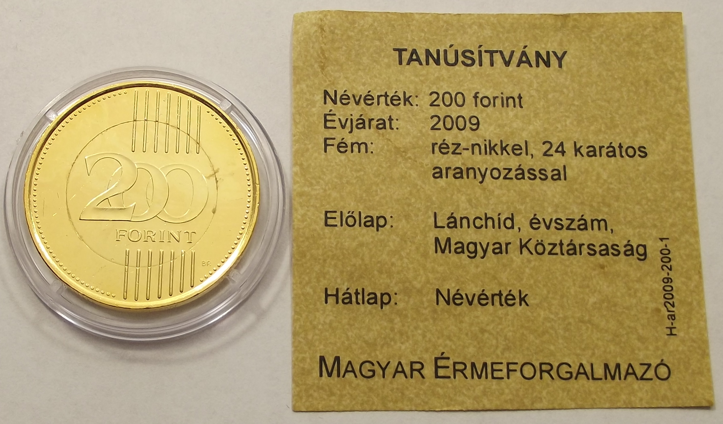 Aranyozott 200 Forint 2009, kiváló állapotban, certificate-el. (ti