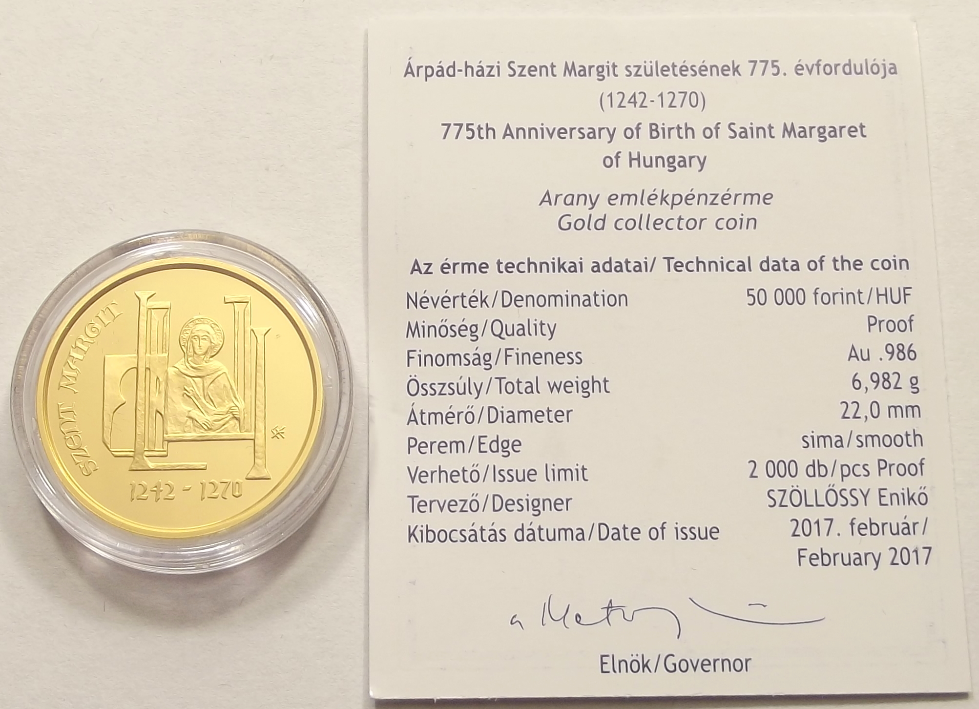 Árpád-házi Szent Margit 50000 forint 2017 PP kivitelben, kiváló állapotban, certificate-el (sl