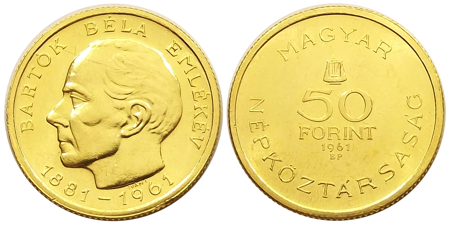 Bartók Béla 50 forint 1961 szép állapotban, enyhe mikrokarcok ill apró peremhiba az érmén. Ritkább darab, mindössze 2500 db készült (n a