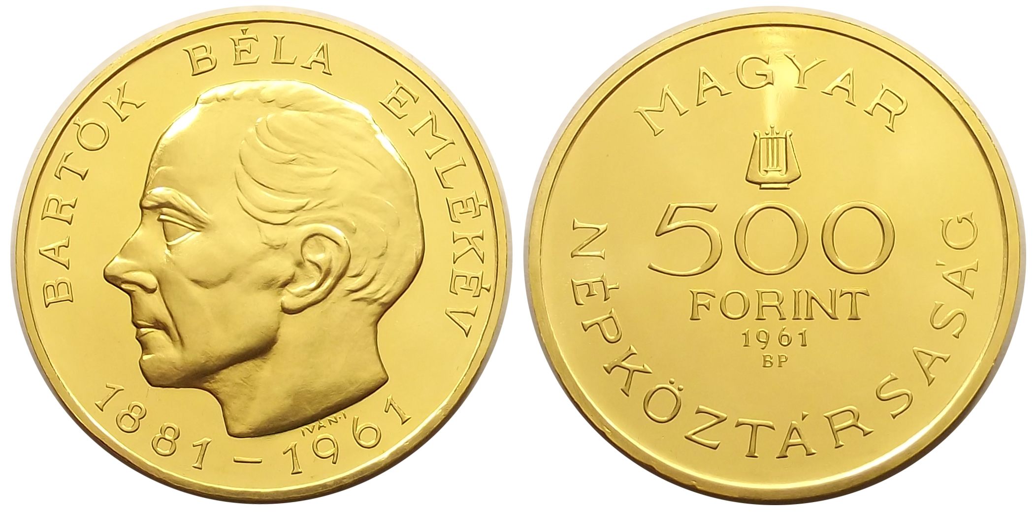 Bartók Béla 500 forint 1961 Proof, extra tartásban. Ritkább darab, mindössze 2500 db készült. Minimális pára az érmén.