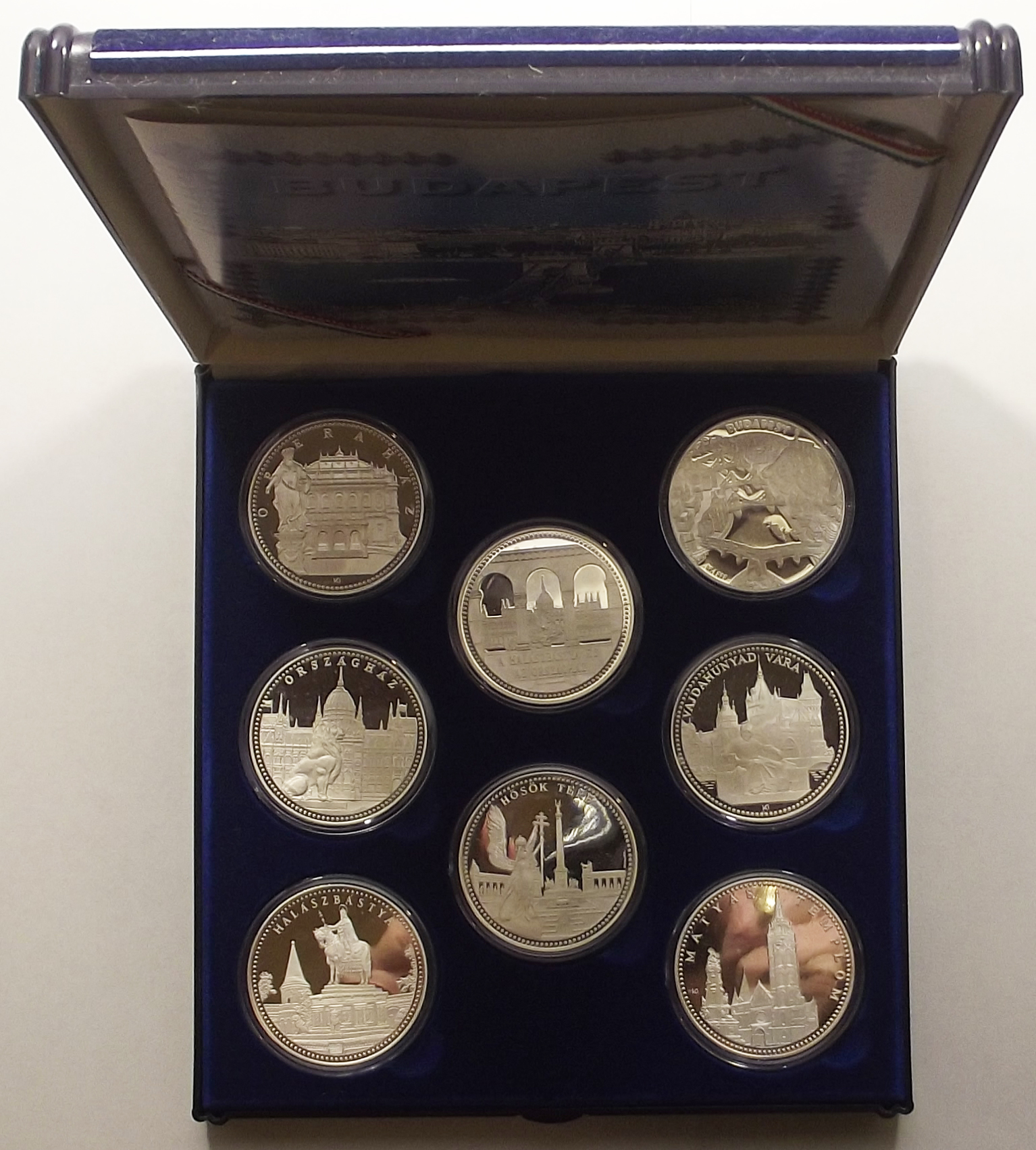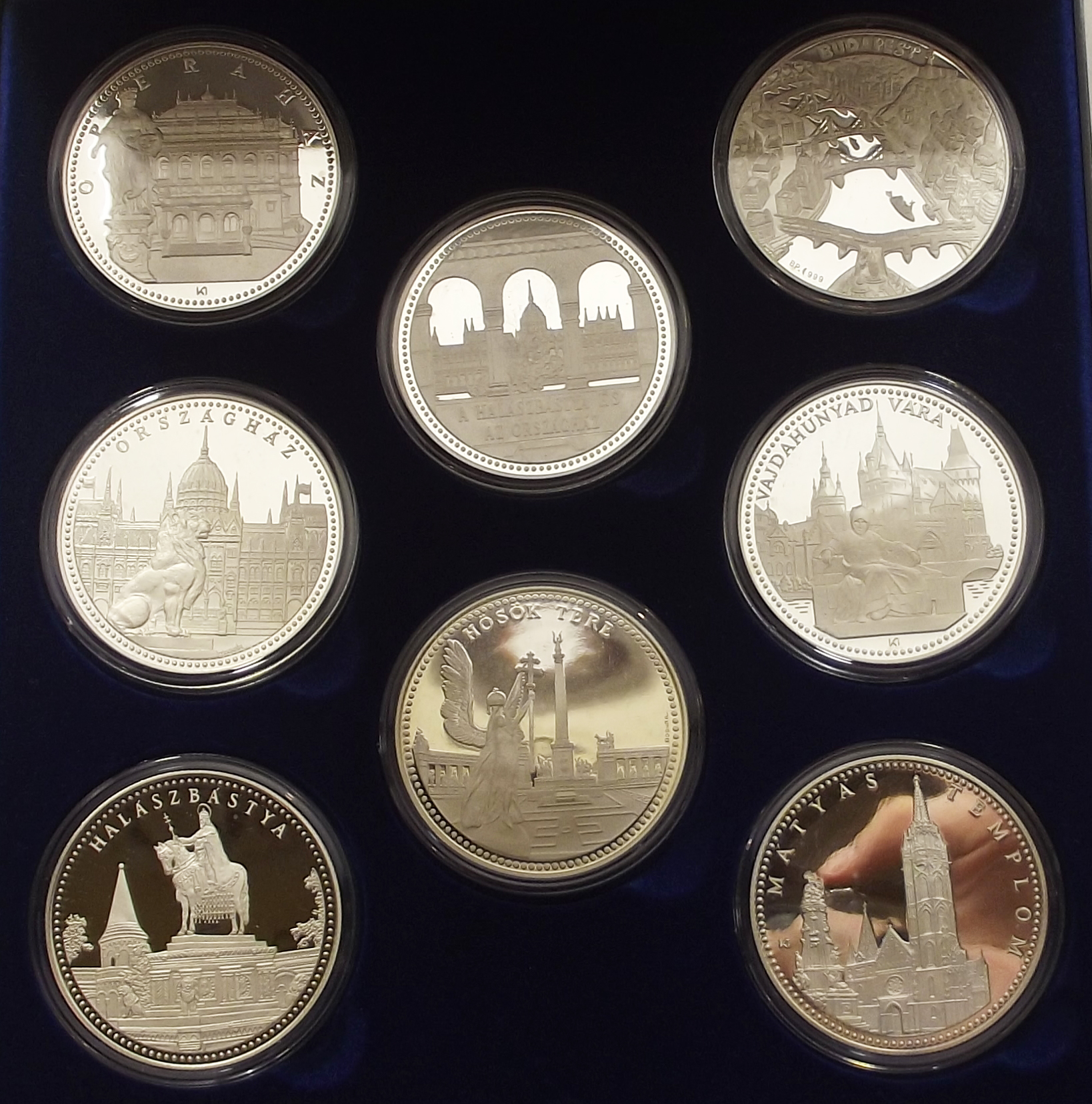 Budapest 8*1 uncia színezüst emlékérem sorozat, kiváló állapotban. 1000 példányban készült a Magyar Pénzverő Rt. kiadásában (jz
