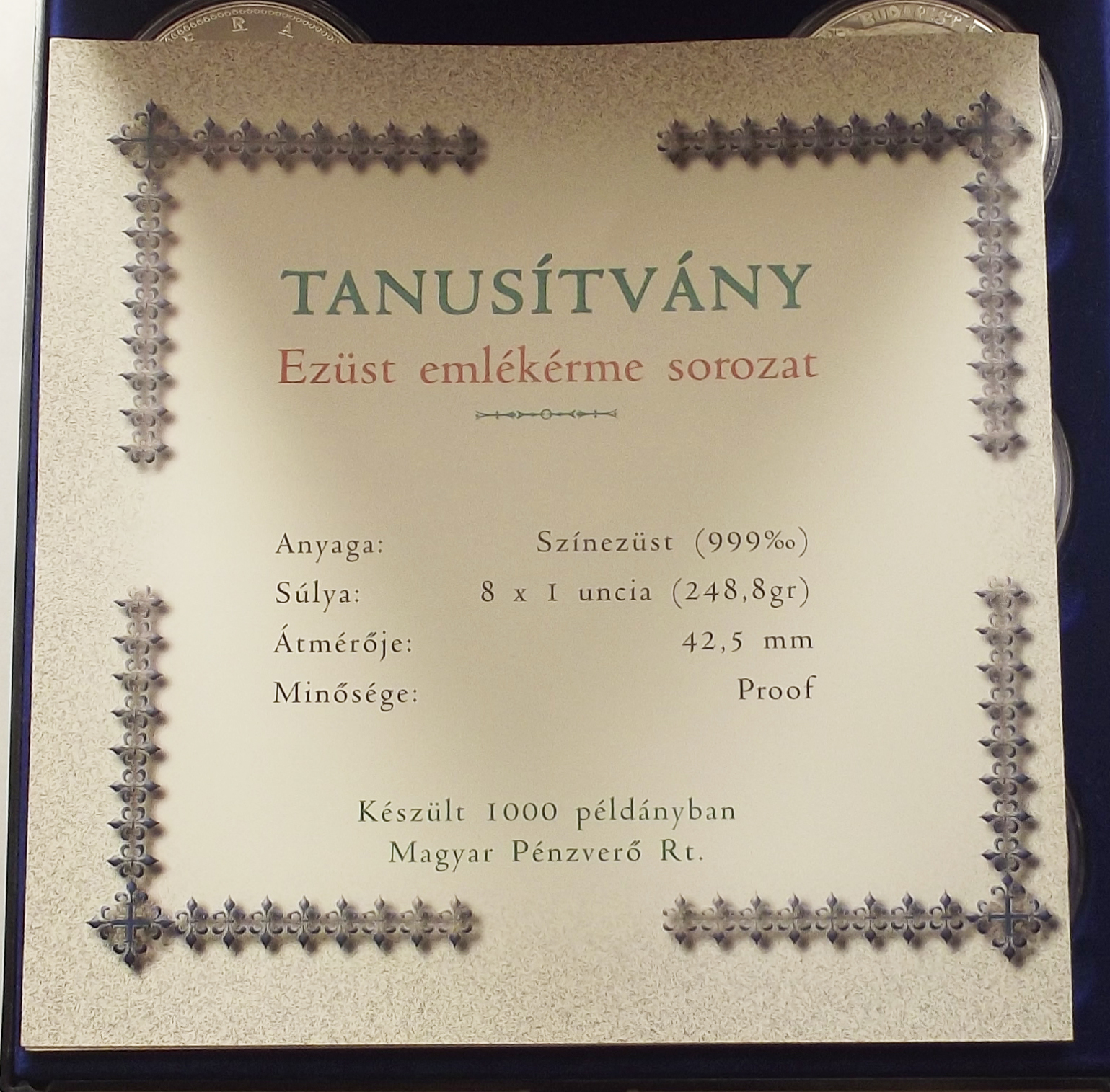 Budapest 8*1 uncia színezüst emlékérem sorozat – díszdoboz, certificate