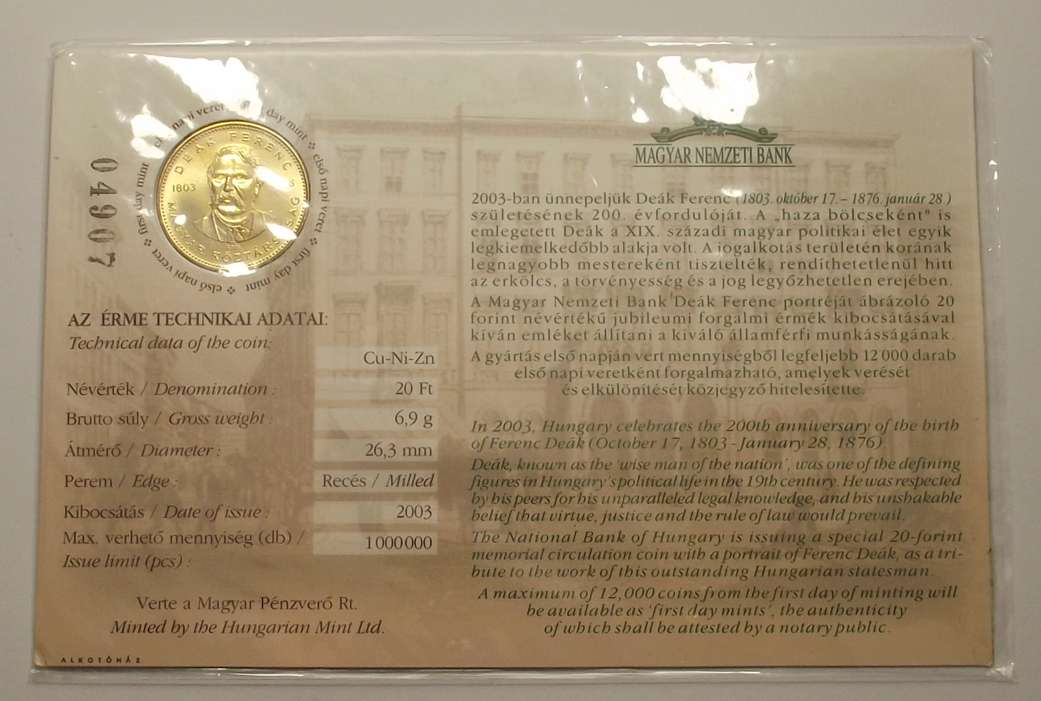 Deák Ferenc 20 forint 2003 elsőnapi veret