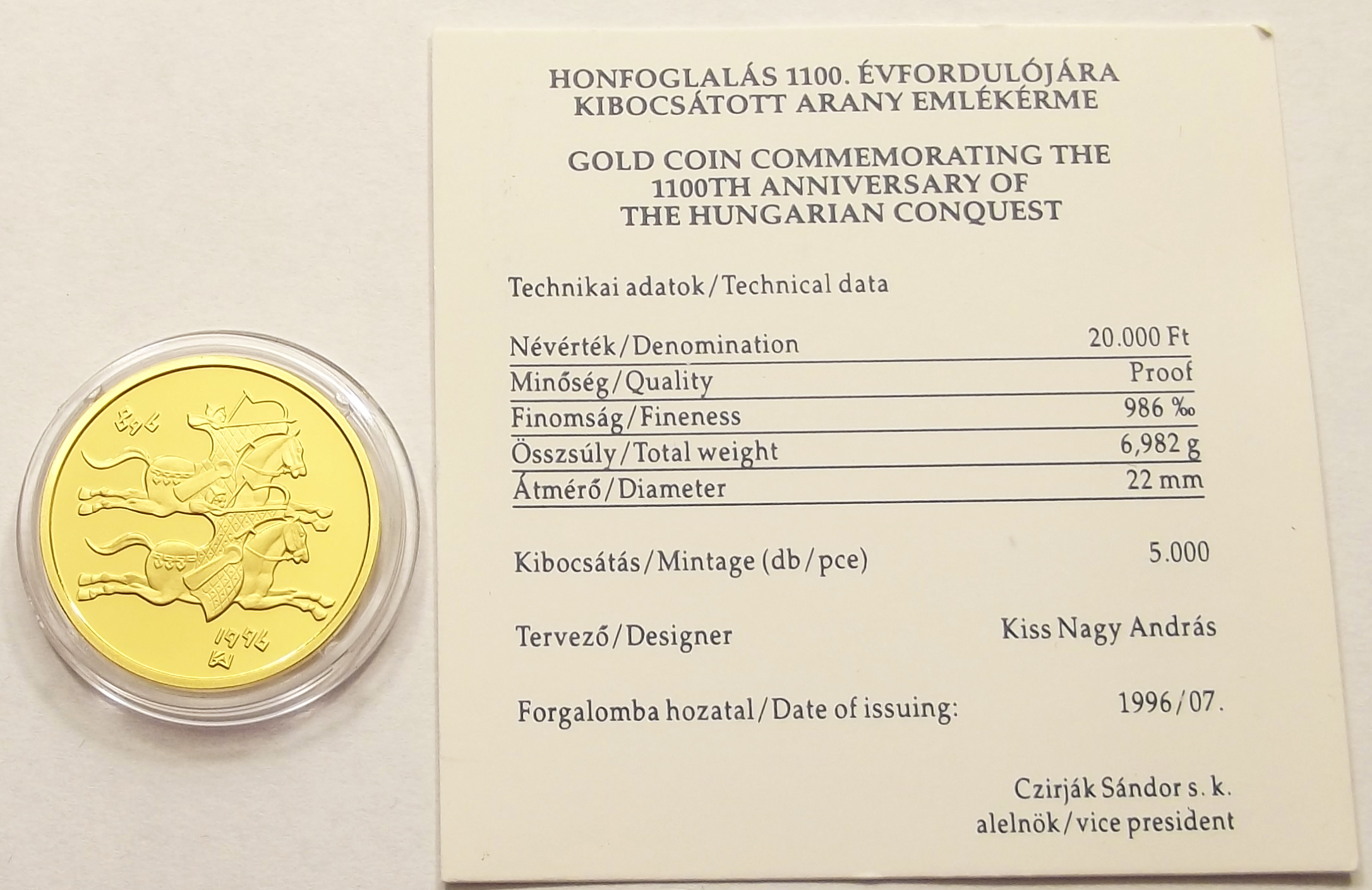 Honfoglalás 20000 forint PP kivitelben, kiváló állapotban, certificate-el (sl