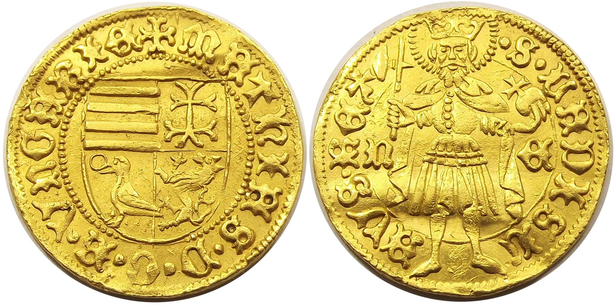 I. Mátyás (1458-1490) aranyforint nagyon szép állapotban, készült 1458-59 között Nagybányán (kamaraispán: Szapolyai Imre királyi kincstartó). Enyhe hullám a lapkán.