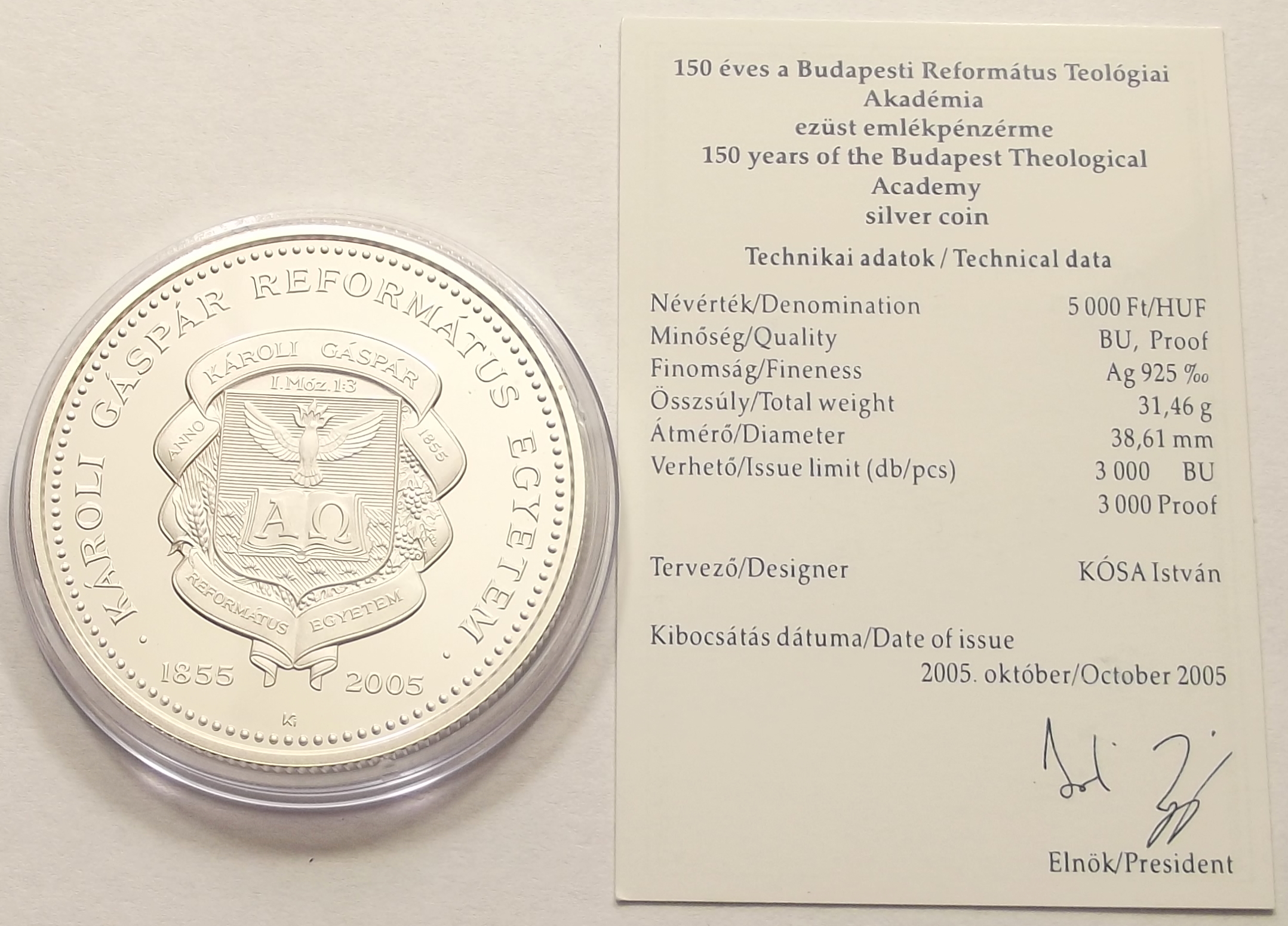 Károli Gáspár Református Egyetem 5000 forint 2005 PP, kiváló állapotban, certificate-el (vl