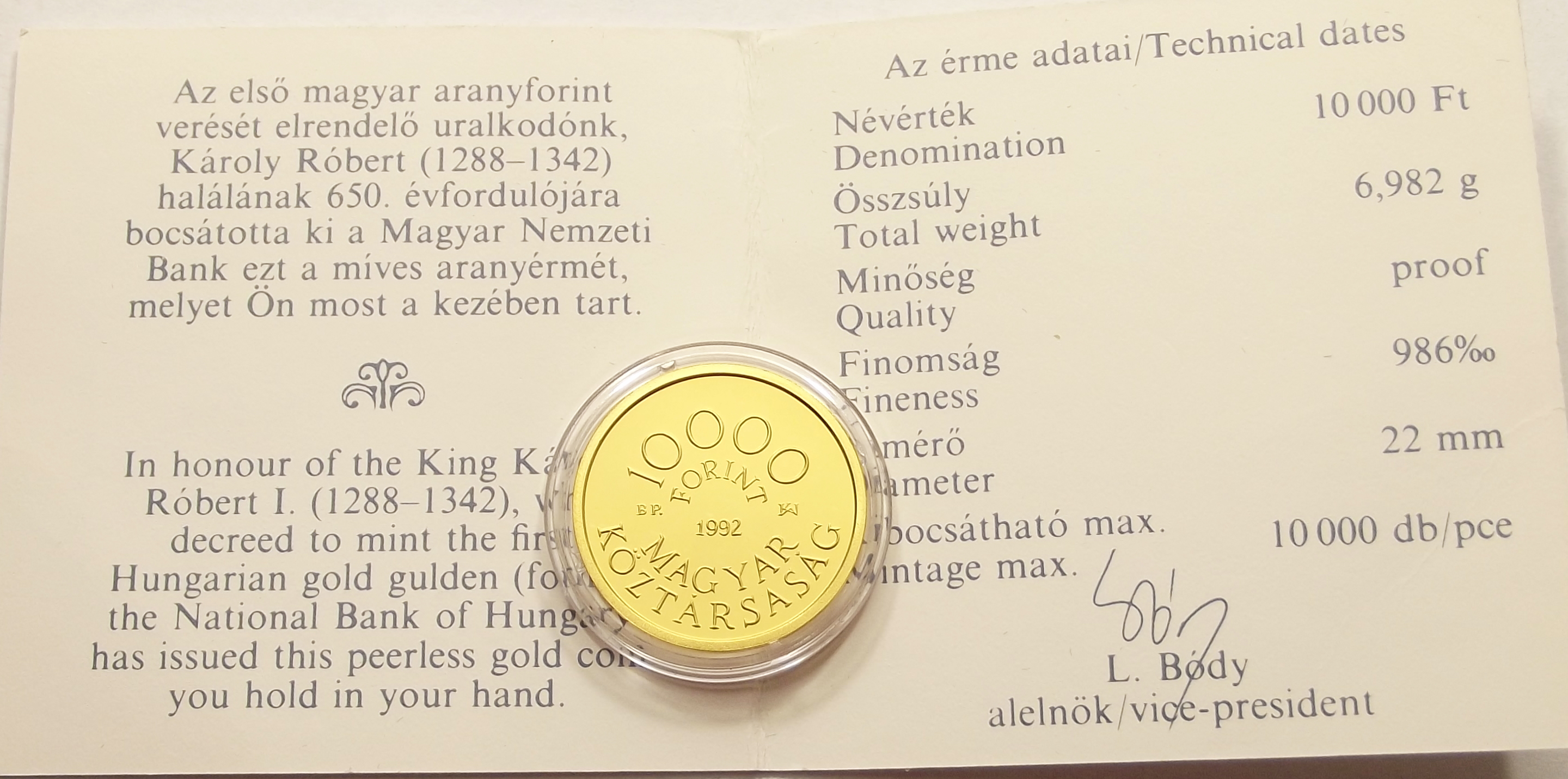 Károly Róbert 10000 forint PP kivitelben, kiváló állapotban, certificate-el (sl