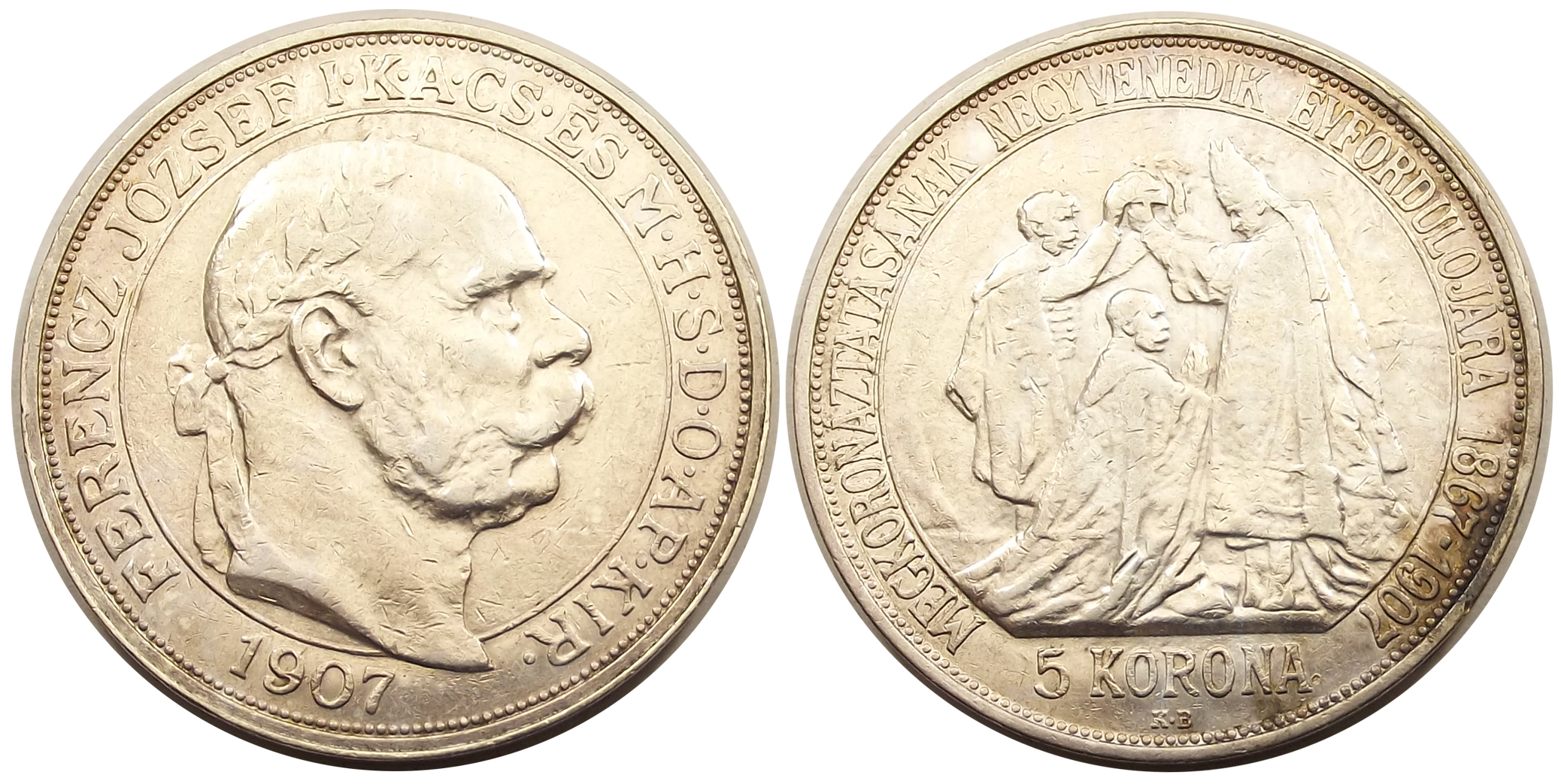 Koronázási 5 korona 1907 Ferenc József, nagyon szép állapotban.(baj